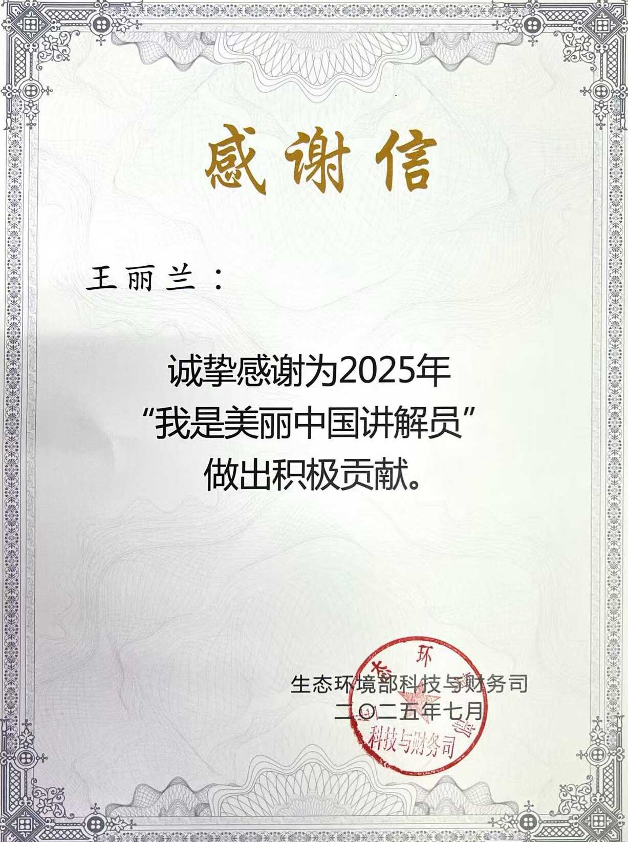 生态环境部科技与财务司的感谢信
