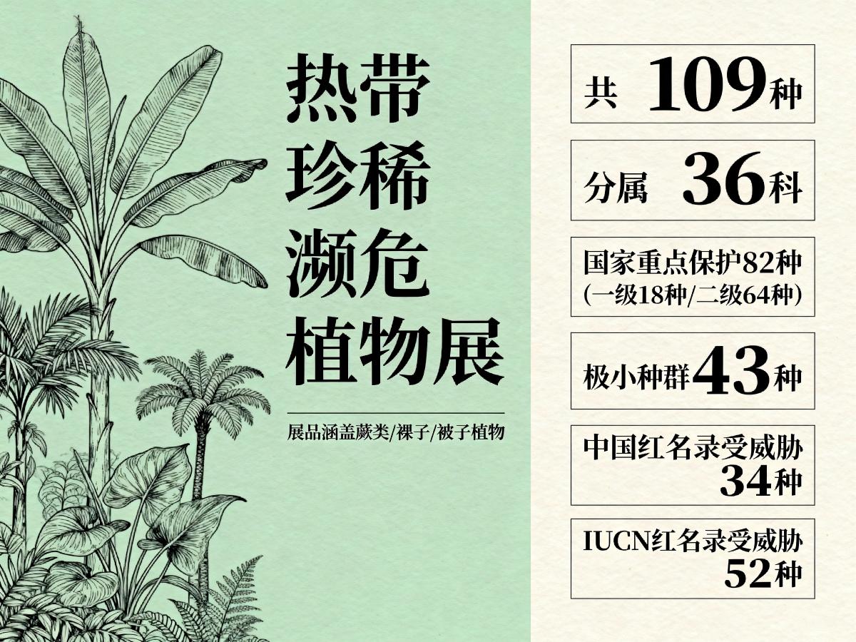 展览重点展示了具有极高生态价值与科研价值的国家Ⅰ级保护植物,如望天树、东京龙脑香等;亦呈现了兼具重要药用价值与观赏价值的物种,如金毛狗、龙血树、虎颜花等;同时,关注了因多种因素致危的物种,如天星蕨、多歧苏铁等,以及据报道已在野外灭绝、目前仅在国内少数植物园进行迁地保护的极端濒危物种——细莪术。