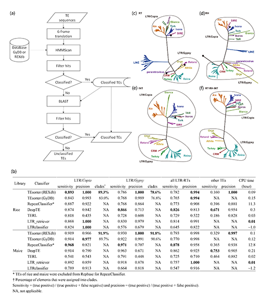 图 (a) TEsorter计算流程; (b) TEsorter与目前5个常用转座子分类软件(RepeatModeler, DeepTE, TERL, LTR_retriever 和 LTRclassifier)在敏感度、准确率及计算时间等参数方面的比较;(c-f ) TEsorter分类结果和基于系统发育方法对水稻和玉米中的LTR类转座子分类的一致性比较。