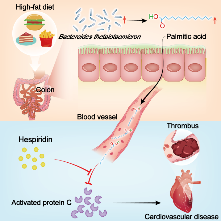 7月31日,中国科学院昆明动物研究所研究员赖仞团队与多伦多大学Heyu Ni教授团队合作开展的研究揭示,在心血管疾病患者中循环棕榈酸水平的升高与高凝状态及肠道多形拟杆菌(Bacteroides thetaiotaomicron)丰度的增加存在显著关联。进一步研究发现棕榈酸通过抑制体内关键内源性抗凝因子活化蛋白C的功能来促进凝血过程,同时增强血小板活化从而诱导血栓形成。此外,多形拟杆菌具有合成棕榈酸的能力,当小鼠接受该菌株移植后,其血浆棕榈酸水平显著上升并引发高凝状态,并且这一过程并未干扰宿主自身的脂质合成途径。值得注意的是,高脂饮食可增强肠道多形拟杆菌的定植能力,进而增加血浆棕榈酸水平。研究还发现,黄酮类化合物橙皮苷能有效阻断棕榈酸与活化蛋白C的相互作用,从而预防由棕榈酸或多形拟杆菌移植所导致的高凝状态。该研究揭示了高脂饮食促进肠道多形拟杆菌定植、升高循环棕榈酸水平而促进血栓形成的机制,为靶向调控棕榈酸和多形拟杆菌以干预心血管疾病提供了新思路。