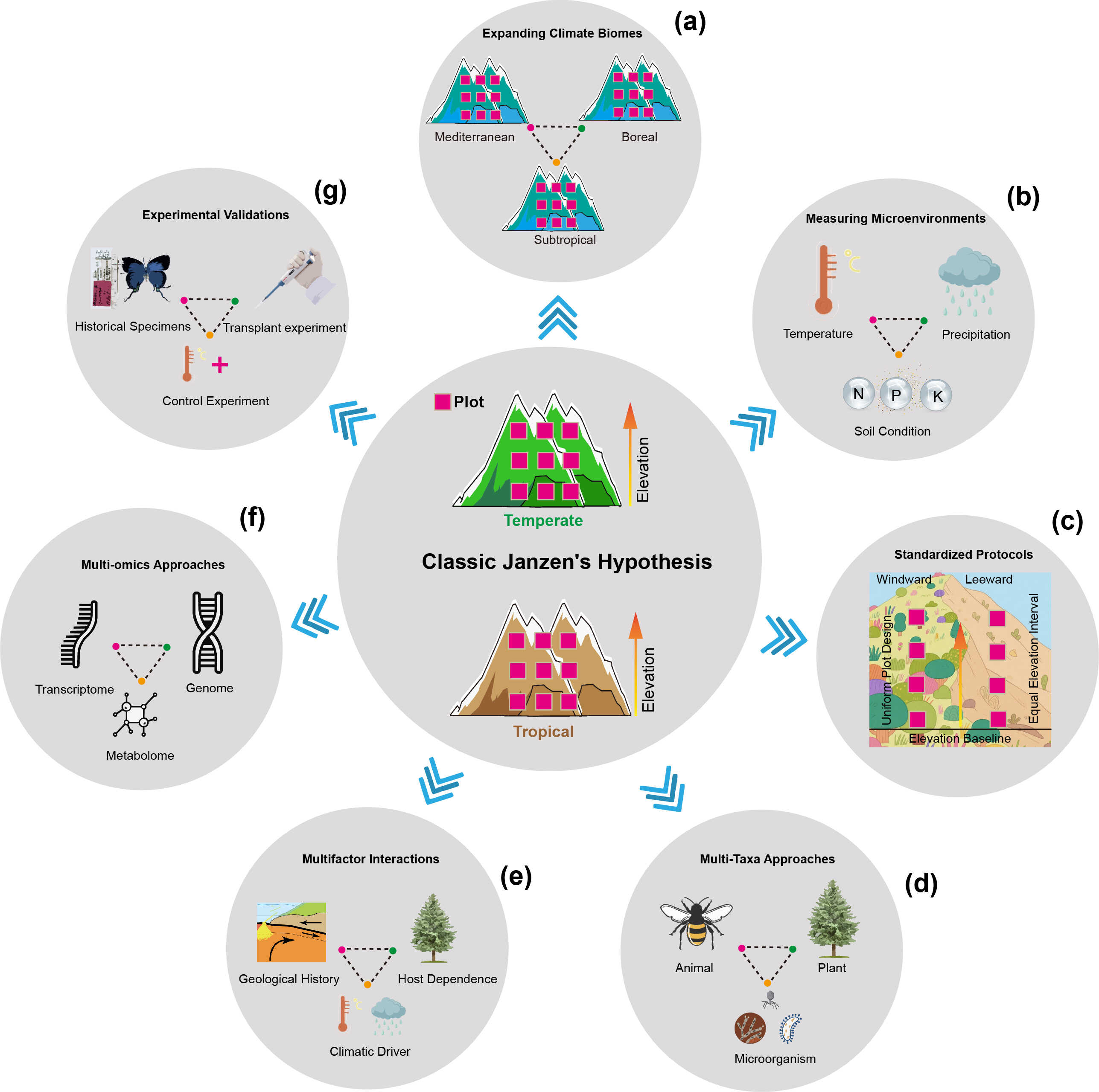 该研究指出最近的研究常将该假说与纬度生物多样性梯度混为一谈,或在采样设计中忽视其机制原理。当前研究存在明显的方法缺陷:或仅关注热带山地(缺乏温带对照),或孤立研究非热带系统(无法验证“热带山口更高”的核心论点)。研究人员提出验证简森假说需严格的实验设计,应覆盖完整气候梯度并控制混杂变量。标准化采样需注意:1)统一微环境(温湿度/土壤)测量;2)从山麓到山顶按固定海拔间隔采样;3)考虑坡向等局域气候差异。未来需整合多类群(动物-植物-微生物)响应、界定假说例外情况(如宿主依赖性生物),并结合功能性状与分子手段(如代谢组/宏基因组,尤其涉及温度耐受性基因、生物地球化学循环基因等)揭示生态机制和生态系统功能响应。从相关性分析转向实验验证:可通过移栽实验(如植物交互移栽、微生物牢笼等方法)、历史标本分析及气候变化控制(如增温、季节性干旱等)实验实现。填补这些研究空白不仅能完善山地生物地理学理论,还将为应对日益加剧的环境变化、制定生物多样性热点区域的保护策略提供科学依据。(图2)