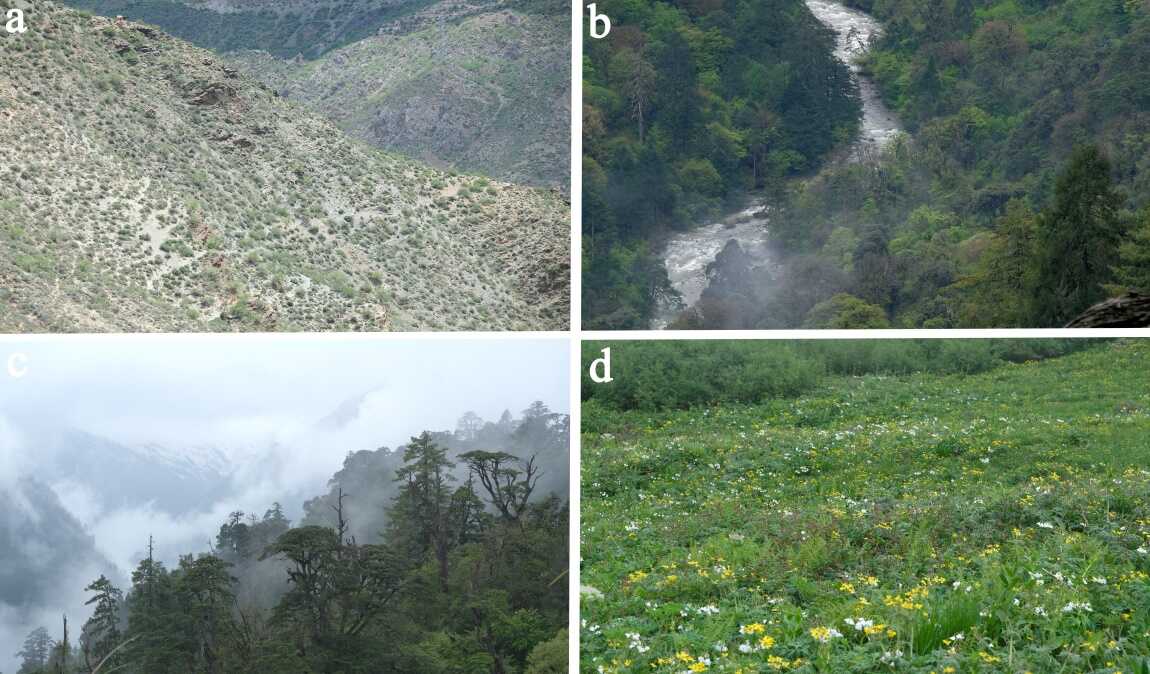 a 干暖河谷马基植被; b 亚热带常绿阔叶林;c 亚高山针阔混交林; d 高山草甸