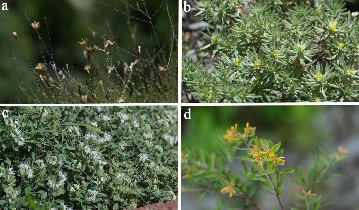 a 针叶帚菊Pertya phylicoides; b 丝毛瑞香Daphne holosericea;c 灰毛莸Caryopteris forrestii; d 羊眼子Wikstroemia ligustrina