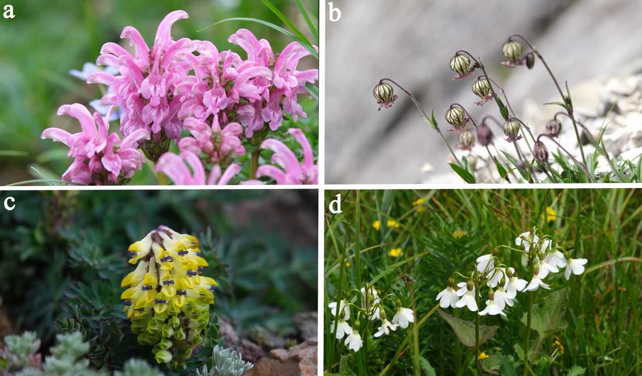 a 贡山马先蒿Pedicularis gongshanensis; b 宽叶变黑蝇子草Silene nigrescens subsp. latifolia; c 钩距黄堇Corydalis hamata; d 乳黄雪山报春Primula agleniana
