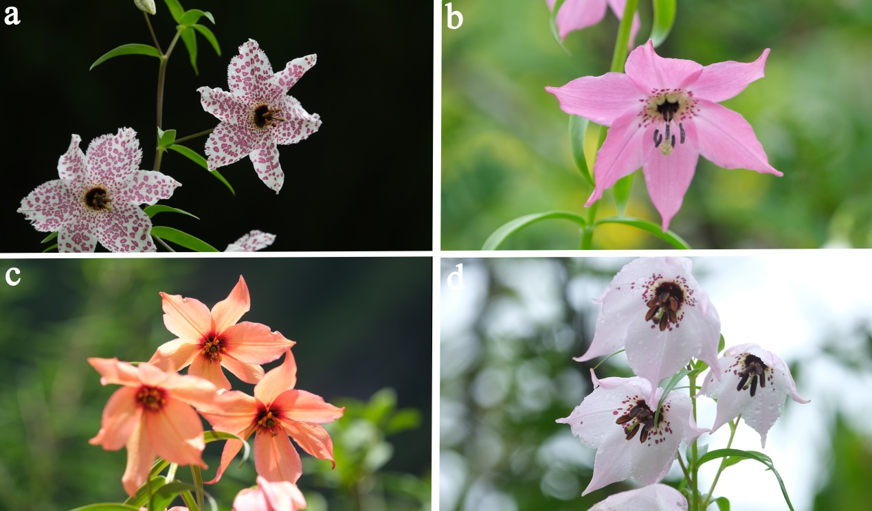a 多斑豹子花Nomocharis meleagrina; b 开瓣豹子花Nomocharis aperta; c 美丽豹子花Nomocharis basilissa; d 滇西豹子花 Nomocharis farreri