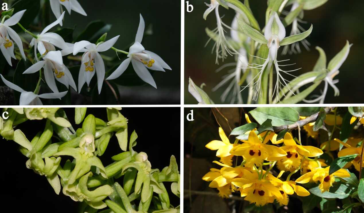 a 卵叶贝母兰Coelogyne occultata; b 长距玉凤花Habenaria davidii; c 剑叶虾脊兰Calanthe davidii; d 金耳石斛Dendrobium hookerianum