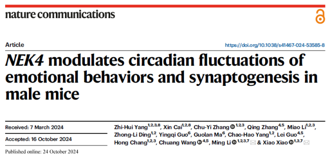 双相障碍的核心临床特征为情绪在抑郁与躁狂状态间反复波动,然而现有动物模型——无论是基于遗传操作还是环境干预——均难以有效模拟这种情绪转换过程,极大制约了对其发病机制的深入解析。中国科学院昆明动物研究所肖潇团队基于双相障碍患者的GWAS数据及脑组织转录组数据分析,发现海马区NEK4表达上升可能是疾病发生的重要风险因素。研究团队分别通过腺相关病毒介导的海马过表达以及H11-LSL-NEK4;CaMKIIα-Cre条件性过表达手段,在小鼠中验证了NEK4高表达可引发情绪行为的昼夜波动:白天表现为焦虑样行为,夜间则转为躁狂样行为,较好地模拟了患者情绪不稳定的核心症状。进一步借助神经元稀疏标记和透射电镜技术,发现NEK4过表达干扰了树突棘形态发生和突触结构昼夜节律的正常波动,提示“突触内部时钟”紊乱可能参与情绪波动行为的发生。值得注意的是,锂盐(经典心境稳定剂)可有效改善NEK4过表达引发的行为与突触结构异常。该研究首次揭示NEK4在脑内表达调控可模拟双相障碍关键临床症状,并提出“突触稳态失衡”可能是情绪波动的重要生物学基础。相关结果发表于《Nature Communications》,文章标题为“NEK4 modulates circadian fluctuations of emotional behaviors and synaptogenesis in male mice”,并获国家发明专利授权(专利号:ZL202410603746.5)——“一种自发出现情绪异常波动的非人哺乳动物模型的构建方法及其用途”。