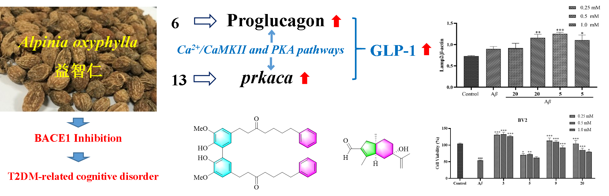 在中医理论中,益智具有收敛和补肾阳功效。该研究基于益智的补肾阳作用发现其中的黄酮和二芳基庚烷类成分具有BACE1 抑制活性,特别是yakuchinone B 以非竞争/反竞争混合方式抑制BACE1活性,结构中的OH-4'与Ser36和Ile126残基形成氢键,是重要的活性位点。进一步与云南中医药大学陈兴龙副教授团队合作,发现4个化合物对Aβ-诱导的BV2细胞损伤具有保护作用,其分子机制与抑制BACE1活性,下调BACE1蛋白表达,增强溶酶体自噬有关(Fitoterapia, 2024, 178,106157)。上述研究表明,中药益智的活性成分除具有降糖作用外,还具有治疗糖尿病认知障碍的潜力。