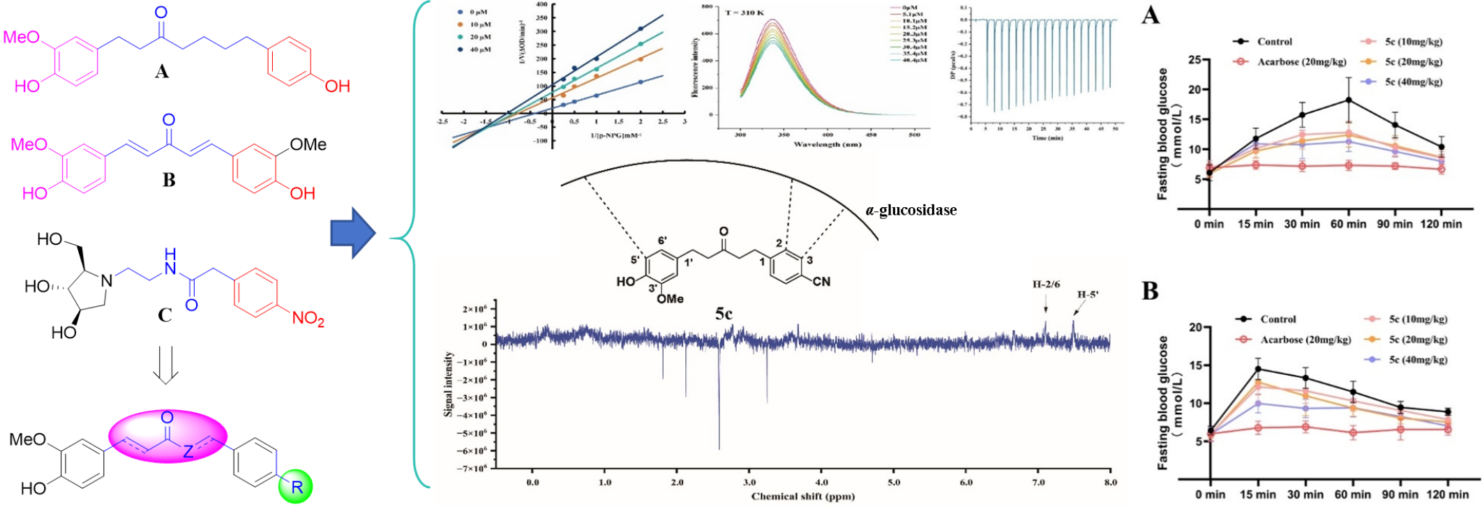 二芳基庚烷是益智的主要降糖活性成分之一,研究团队基于二芳基庚烷的基本骨架通过骨架跃迁和官能团替换策略,设计合成了24个新型α-葡萄糖苷酶抑制剂,构效关系分析表明4-氰基为关键药效团,揭示电子效应是酶抑制活性的决定因素。特别是4-氰基取代衍生物5c具有显著的α-葡萄糖苷酶抑制活性(IC50=18.1 μM),是阿卡波糖活性的17倍。通过多光谱分析和分子对接研究了该分子的酶抑制机制,表明主要通过焓-熵协同驱动机制与α-葡萄糖苷酶发生可逆结合,作用模式包含氢键作用、静电作用和疏水作用,诱导酶二级结构改变,从而降低酶的表面疏水性。同时,该化合物对α-葡萄糖苷酶的抑制活性受大分子拥挤环境的显著影响,提示空间位阻效应和疏水分配作用在配体-靶标识别中的重要性。该化合物能剂量依赖地降低淀粉和蔗糖负荷小鼠的血糖水平,具有潜在的降糖作用(Eur. J. Med. Chem., 2025, 300,118161)。综上,该研究发现的新型二芳基戊烷类分子,具有强效的体外和体内α-葡萄糖苷酶抑制活性以及良好的药代特性,是一类新型抗糖尿病药物候选分子。