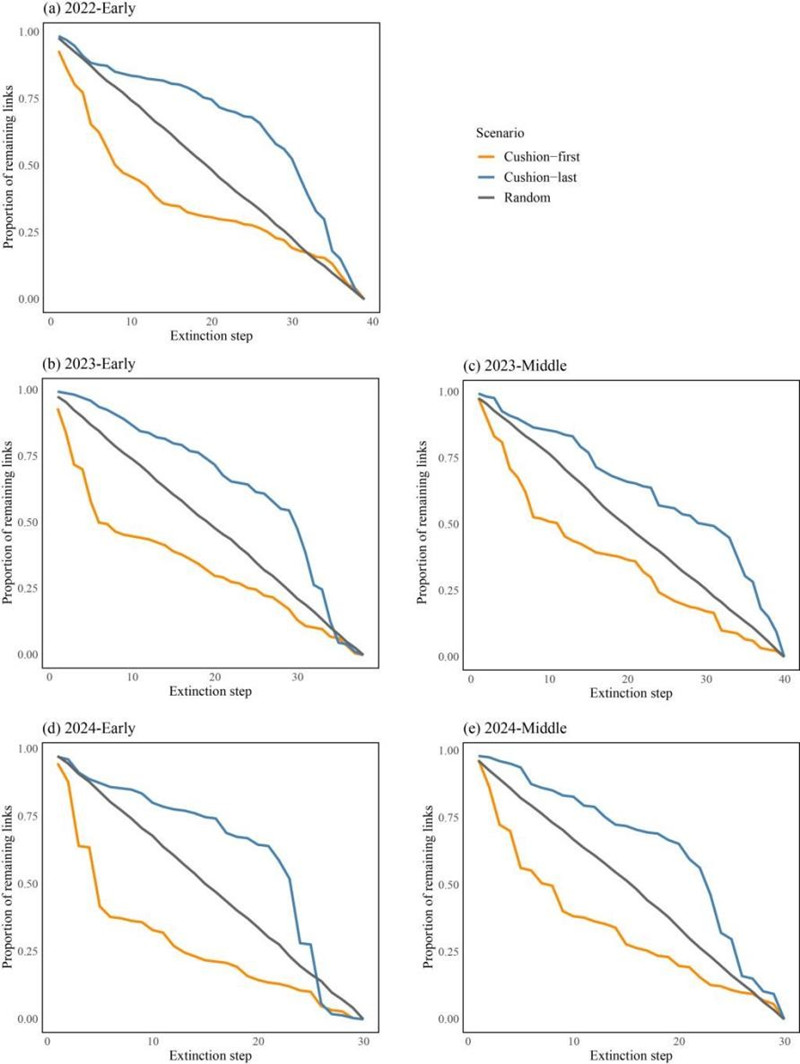 其次,研究人员基于物种互作理论和方法,连续三年系统监测了横断山高山冰缘带同一群落内九种共生垫状植物在不同物候期对昆虫多样性及其群落动态的影响。研究发现,垫状植物始终比其他物种维持着更高的昆虫物种与个体数量,其物种数量高出3.5-4.2倍,个体数量高出4.5-8.8倍。通过在不同季节维持7-46种“特有”昆虫物种,垫状植物使群落昆虫总物种数提升25.93%~112.20%,个体总数提升2.31%~41.64%。网络结构(图2)分析表明,垫状植物处于更核心的网络位置(即具有更高的近中心性与中介中心性),常作为网络模块枢纽或连接节点,而其他植物则多处于网络边缘。物种灭绝模拟结果进一步印证了垫状植物在群落中的核心生态地位:若优先移除垫状植物,昆虫群落存续能力将出现最快速衰退;相反,在优先移除其他植物物种的情境下,昆虫群落呈现最慢的二次灭绝速率(图3)。该研究证实了垫状植物是高山冰缘带生态系统中植物-昆虫互作网络中的关键种,通过构建和维持复杂的物种互作网络提升并维持昆虫多样性。尽管气候变化可能缓解部分环境压力,但多数昆虫仍将依赖垫状植物提供的适宜微生境实现种群维持。相关研究近期以Cushion plants increase and maintain alpine insect diversity through sustaining plant–insect interaction networks为题在线发表于生态学经典期刊Oikos。昆明植物研究所与西南林业大学联合培养硕士研究生牛梦秋和云南大学已毕业博士研究生张涛为论文共同第一作者,昆明植物研究所陈建国研究员为通讯作者。昆明植物研究所已毕业博士研究生钱栎屾、硕士研究生林洁、杨鹏飞、黄美红,昆明植物研究所孙航院士、西南林业大学廖周瑜教授参与了该研究工作。