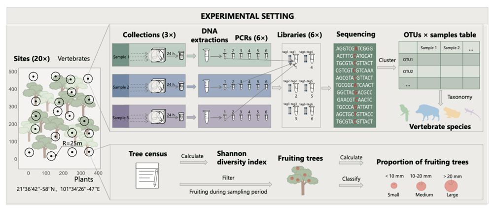 该研究成果以 Airborne eDNA reveals resource-based assembly of frugivorous vertebrates 为题,近期发表于国际分子生态学期刊 Molecular Ecology Resources上。版纳植物园森林生态系统结构、功能与动态研究组博士后蔡望为第一作者,杨洁研究员为通讯作者;云南大学联培硕士研究生李云翱、昆明动物研究所生物多样性基因组中心杨春燕副高级工程师为该论文共同第一作者。研究得到中国博士后科学基金、云南省“彩云博士后”计划、版纳植物园“十四五”科技创新规划及中美生物多样性合作研究项目等资助。