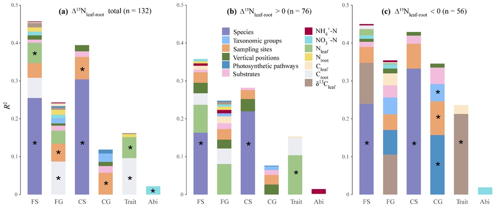 图4 云南西双版纳热带地区附生维管植物根叶分馏(∆15Nleaf−root)驱动因素