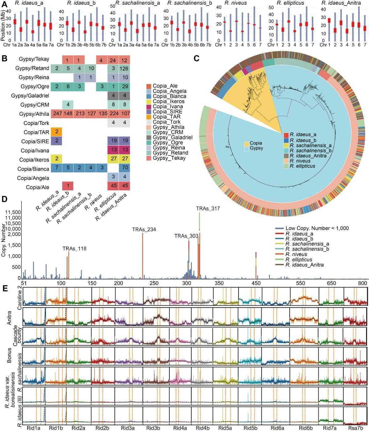 中国科学院昆明植物研究所泛第三极植物多样性家谱及生存策略攻关团队首先解析了4种野生悬钩子高质量基因组,包括高杂合野生二倍体红树莓(R. idaeus)及其近缘种库页悬钩子(R. sachalinensis)的单倍型基因组,以及西南地区广布的低杂合二倍体椭圆悬钩子(R. ellipticus)和红泡刺藤(R. niveus)的染色体级基因组。基于新组装以及已发表的基因组,团队构建了悬钩子属泛基因组,鉴定出10,243个核心基因家族,这些基因是树莓生长发育的基础遗传保障。值得注意的是,该研究在高杂合度的二倍体野生树莓中区分出A/B亚基因组,并发现着丝粒区域含有亚基因组特异性的k-mer序列,这些序列富集了不同的Gypsy/Athila类LTR反转录转座子,推测着丝粒序列差异可作为亚基因组分型以及追溯起源演化的“进化指纹”。