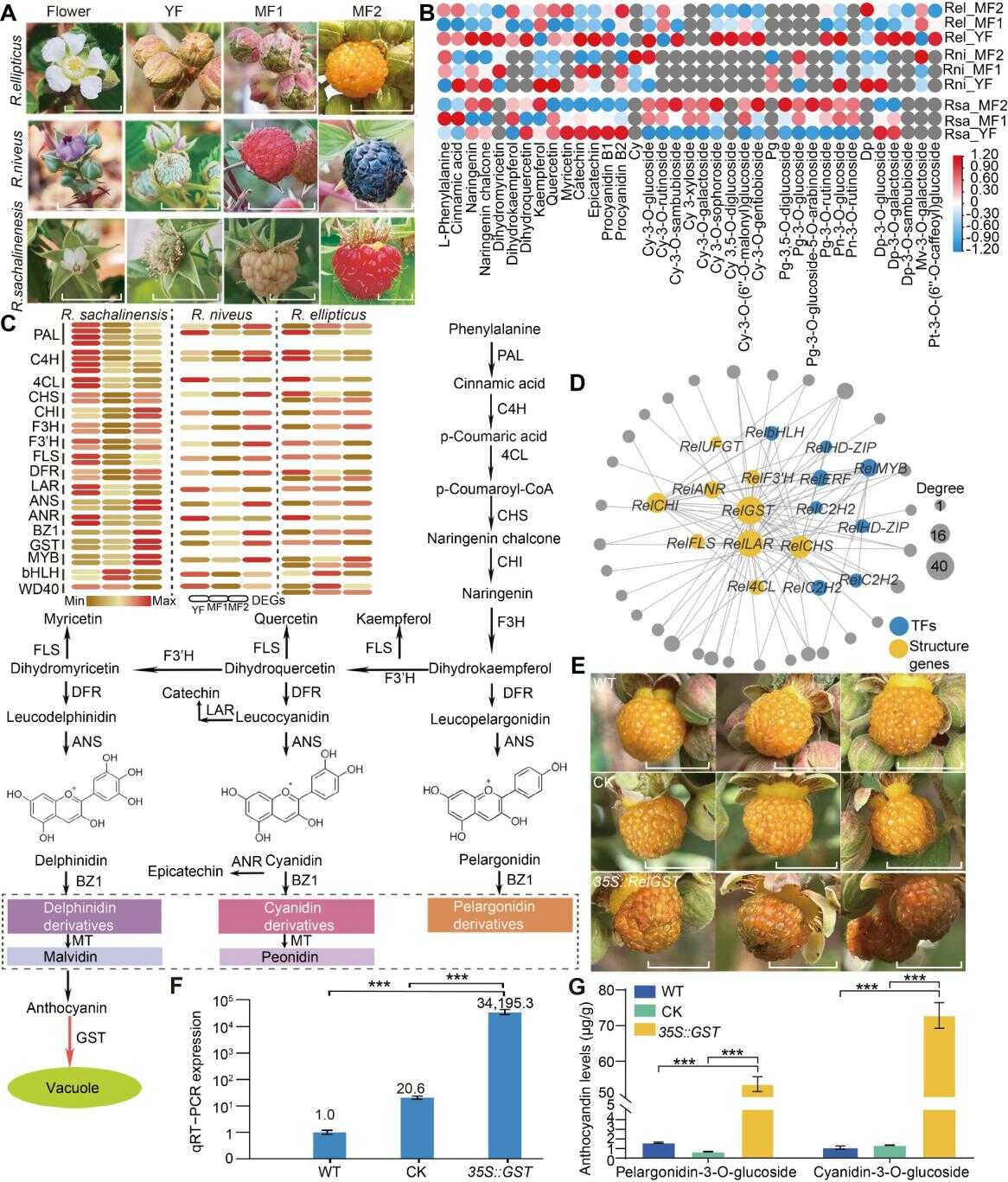 通过整合红、黄、黑三种果实颜色的不同悬钩子物种主要发育阶段的代谢与表达谱数据,研究团队揭示了果实品质性状形成的遗传机制。代谢分析显示,在果实成熟过程中药用成分(黄酮、酚酸、萜类)逐渐减少,而营养成分持续积累,提示“未成熟果侧重防御、成熟果吸引传播者”的生态策略,为优化药用与食用采收期提供了理论依据。整合转录组分析发现椭圆悬钩子的黄色果实虽然能够正常合成花青素(如飞燕草素、矢车菊素),但因谷胱甘肽转移酶基因(RelGST)表达受抑,导致花青素无法有效转运至液泡积累,而叶黄素等类胡萝卜素的积累使得果实呈现黄色。通过瞬时过表达RelGST可使黄果显著变红,且花青素类化合物的含量提升近200倍,证实了其为果实颜色限制因子,为树莓果实颜色育种提供了候选靶基因。
