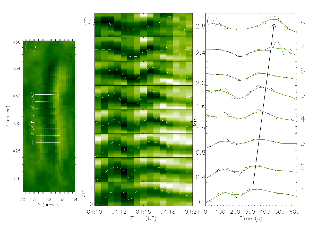 图1:幅(a)为纤维结构的放大视图。白线表示用于分析横向振荡的位置。幅(b)为位置1-8对应的时空图。幅(c)为拟合最小强度曲线。