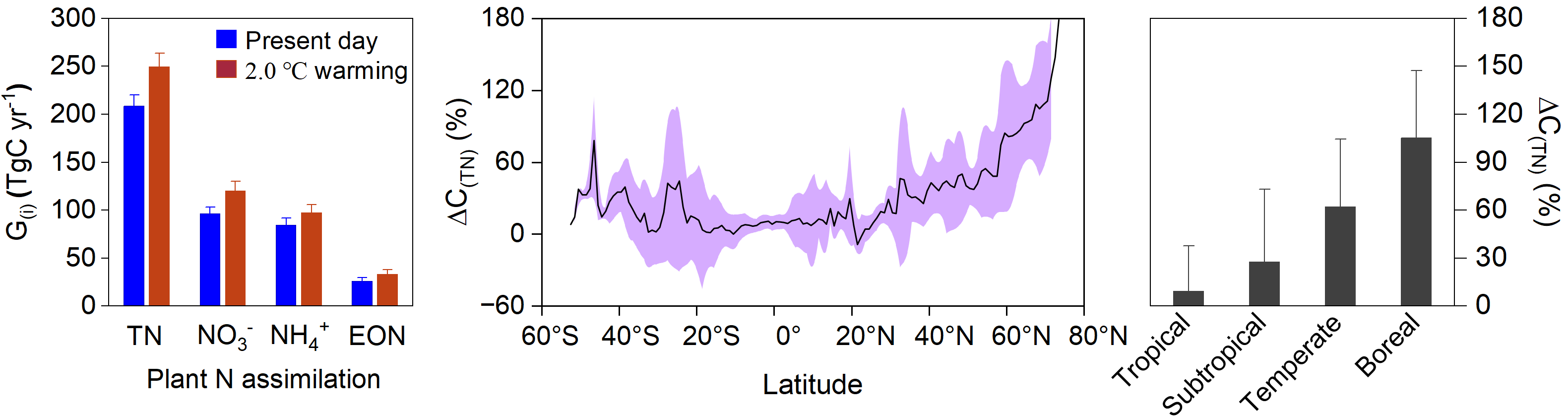 (G(i)指全球陆生植物总氮(TN)、硝酸根(NO3-)、铵根(NH4+)、可提取有机氮(EON)同化的碳消耗总量;∆C(TN)指变暖情景下(2.0°C warming)植物总氮同化的碳消耗相对于当前(Present day)的变化幅度)