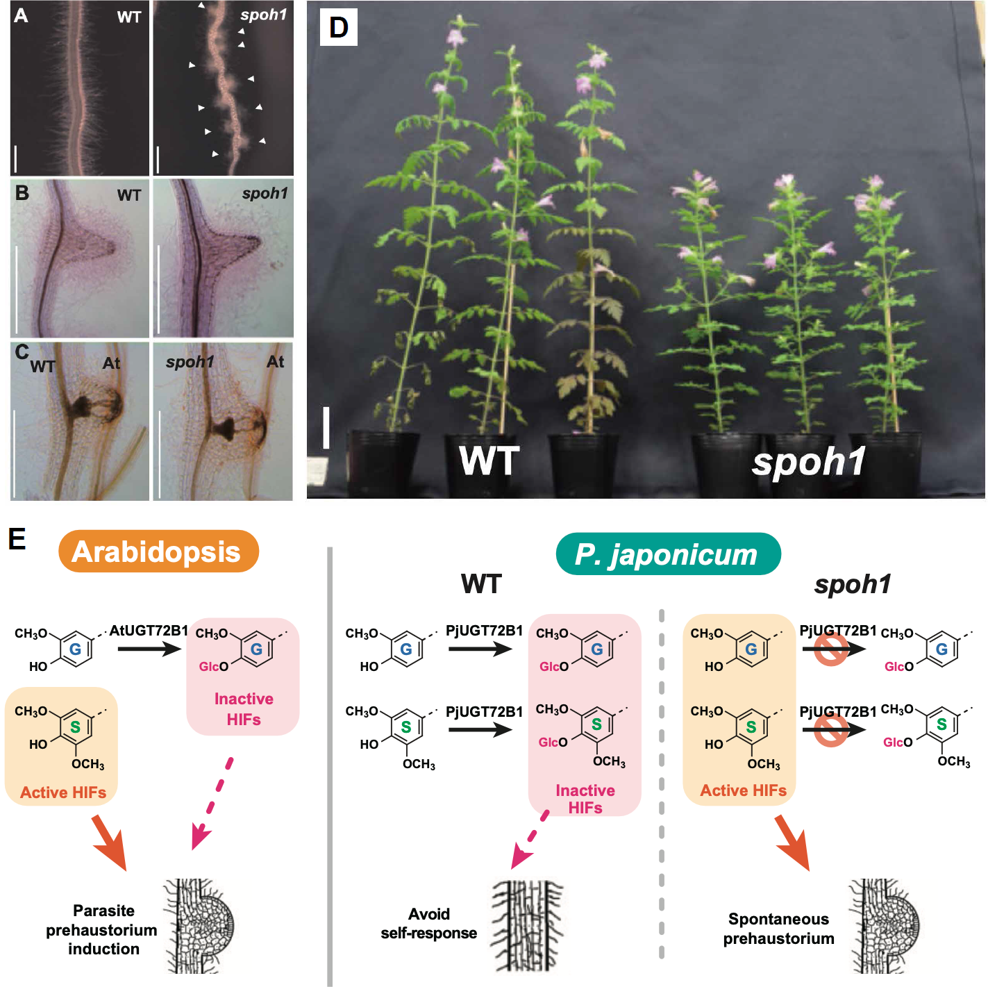 该发现源于松蒿的突变体库筛选。通过科研人员的大量前期工作,获得了spoh1突变体,该突变体植株无需外源HIFs即可在蔗糖介质上自主形成原吸器,形态与DMBQ诱导野生型(WT)松蒿的吸器无异。spoh1根分泌物对WT松蒿及近缘寄生植物独脚金(Striga hermonthica)吸器诱导活性增强,相当于1 µM DMBQ水平,从而证实此突变体的HIFs释放增多。全基因组测序锁定spoh1为PjUGT72B1的提前终止突变,导致此酶功能缺失。PjUGT72B1定位根成熟区,主要通过O-葡萄糖基转移酶(OGT)活性糖基化G/S型HIFs的4-OH位点,生成失活形式(如SyA-Glc)的HIFs,使其丧失诱导活性。体外实验证实PjUGT72B1对S型HIFs更高效,而非寄生植物的拟南芥同源AtUGT72B1仅限对G型HIFs有活性——这种底物特异性差异揭示了列当科寄生植物如何通过“掩盖”自身的HIFs,从而避免“自相残杀”的生理和进化生物学机制。