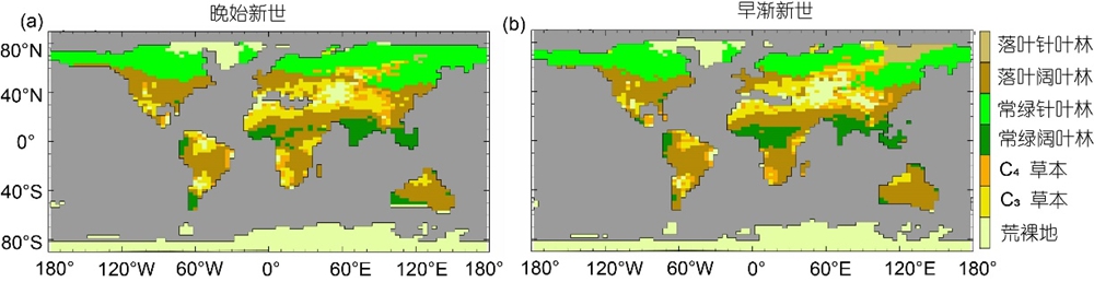 图 2 基于Sheffield动态全球植被模型(Sheffield Dynamic Global Vegetation Model,SDGVM)模拟晚始新世-早渐新世植被类型的变化。(a)模拟晚始新世全球植被类型,(b)模拟早渐新世全球植被功类型。
