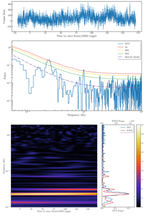 云南天文台研究人员采用快速傅立叶变换(FFT)和加权小波Z变换(WWZ)方法,对该事件的Fermi卫星伽玛射线观测数据进行了详细的时间序列分析。在Fermi的第一次触发(GRB 250702D)中,未发现任何准周期震荡(QPO)信号;在第二次触发(GRB 250702B)中,检测到约为0.024 Hz(对应周期约41.7秒)的QPO信号;在第三次触发(GRB 250702E)中,则发现了约为0.046Hz(周期约21.7秒)的QPO信号。图一展示了第三次触发(GRB 250702E)的光变曲线及其对应的FFT和WWZ功率谱。在事件发生后,研究人员迅速开展分析,并在短时间内取得上述QPO信号的重要研究成果,为理解该爆发的天体起源和物理机制提供了关键线索。