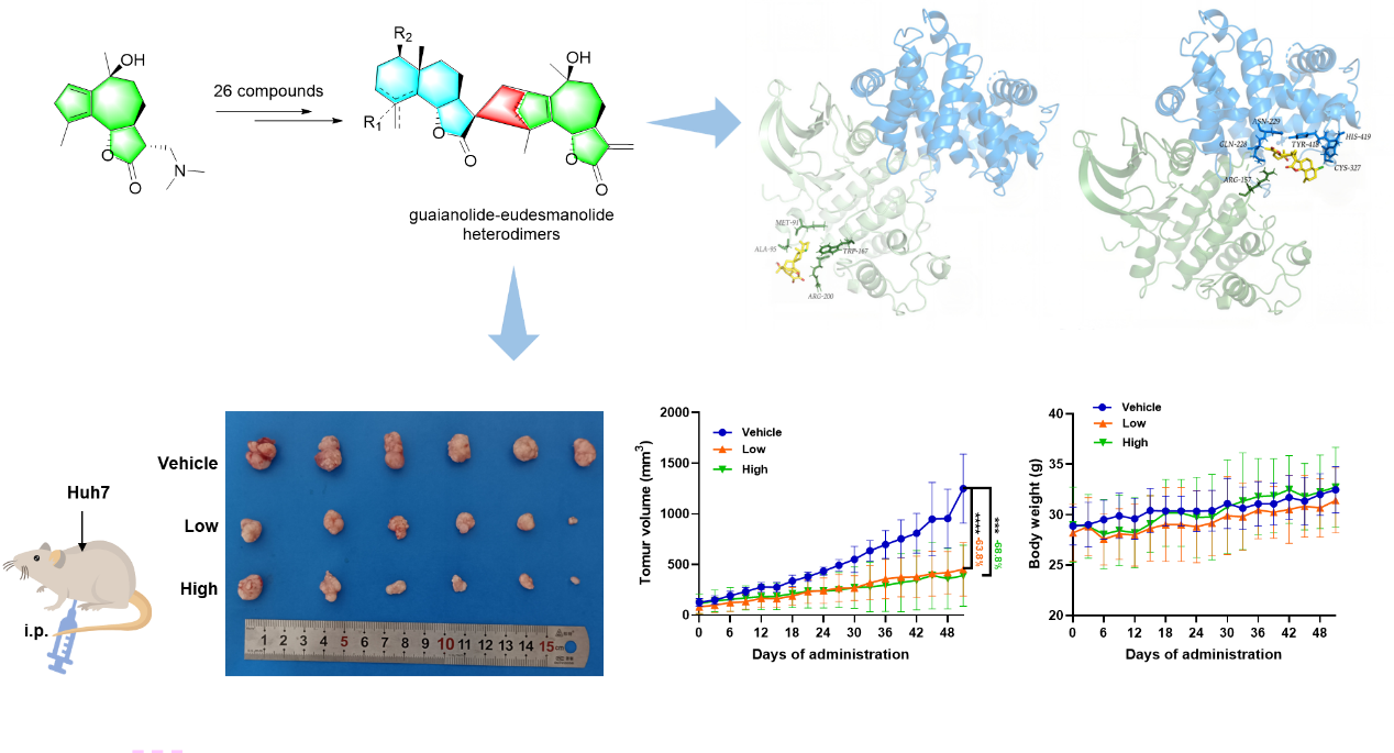 肝癌是全球范围内第六大恶性肿瘤,致死率高,新发病例严重,中国每年新发肝癌患者40余万例,研发新型治疗肝癌药物具有重要意义。中国科学院昆明植物研究所陈纪军研究团队致力于蒿属植物中抗肝癌活性倍半萜二聚体的发现、合成与结构优化、作用机制与靶标及创新药物研究。团队前期从数十种蒿属植物中发现了系列具有显著抗肝癌活性的不同结构类型的倍半萜二聚体,作用于肝癌发生的不同阶段和靶标,具有显著体外、体内抗肝癌作用。然而,二聚体在植物中含量极低,深入研究受限。此外,天然来源的倍半萜二聚体多由相同结构类型的倍半萜聚合而成,不同结构类型倍半萜间聚合形成的杂二聚体则较少。