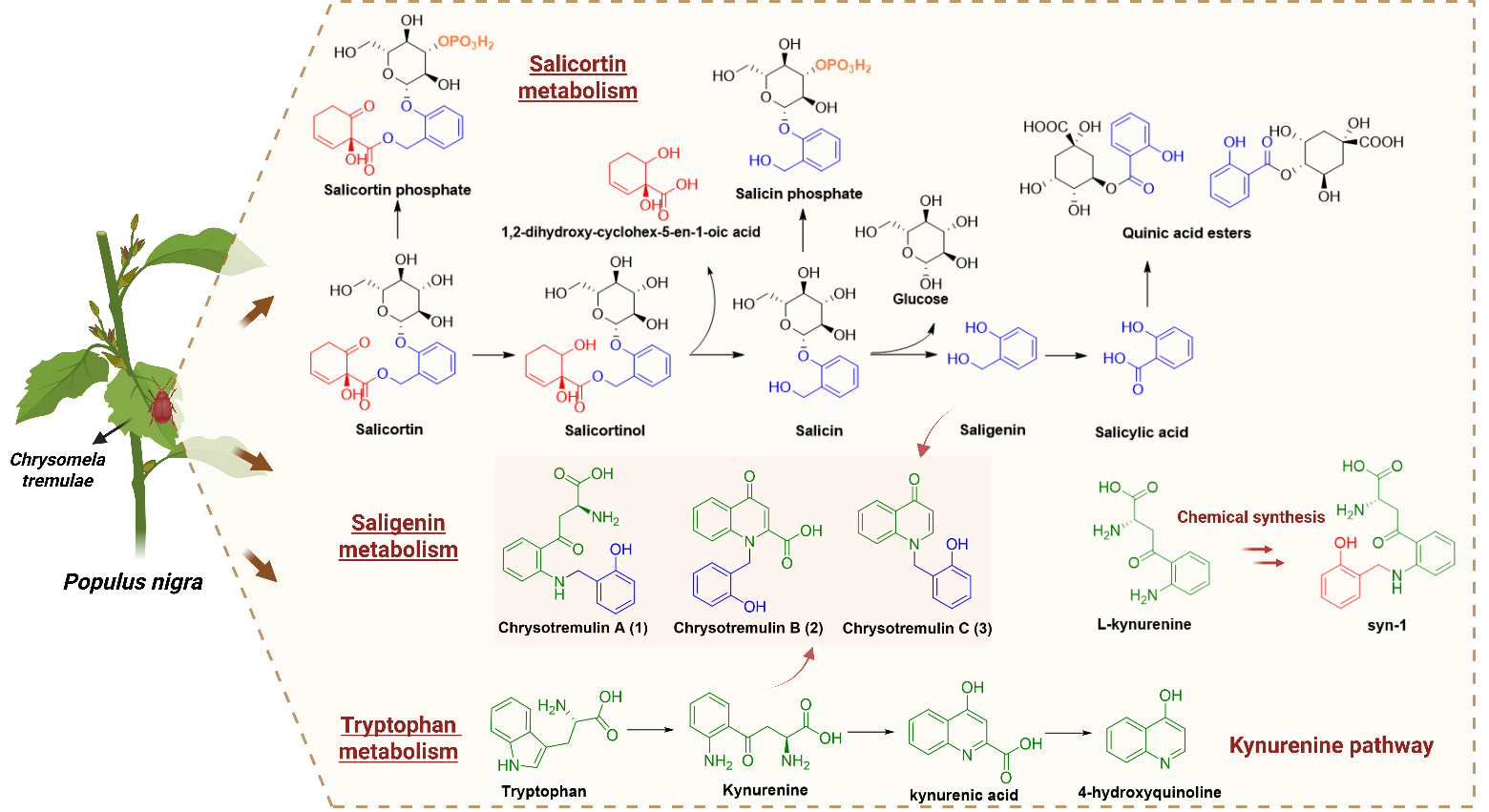 为揭示其背后的机制,中国科学院昆明植物研究所植物化学与天然药物全国重点实验室彭惺蓉副研究员与德国马普化学生态所团队合作,以杨叶甲为模型系统,采用同位素标记结合靶向/非靶向LC-MS代谢组学,并辅以结构表征的方法,追踪并确证salicortin的代谢途径。在此过程中,首次发现了杨叶甲能够利用必需氨基酸色氨酸及其分解产物(包括犬尿氨酸、犬尿酸和4-羟基喹啉)与水杨苷代谢物水杨醇形成新型结合物,最终通过虫粪排出体外。水杨醇及其结合物对杨叶甲无毒害作用,类似代谢途径在其他杨树食草昆虫中也得到证实。尤其是在亲缘关系较远的杨树植食昆虫Laothoe populi和 Saperda carcharias体内检测到结合物,这表明了色氨酸辅助解毒机制的趋同进化。而鞘翅目的Saperda carcharias与鳞翅目的Laothoe populi在进化上已分离超过3亿年,这一发现表明,这一代谢性状是独立起源的。