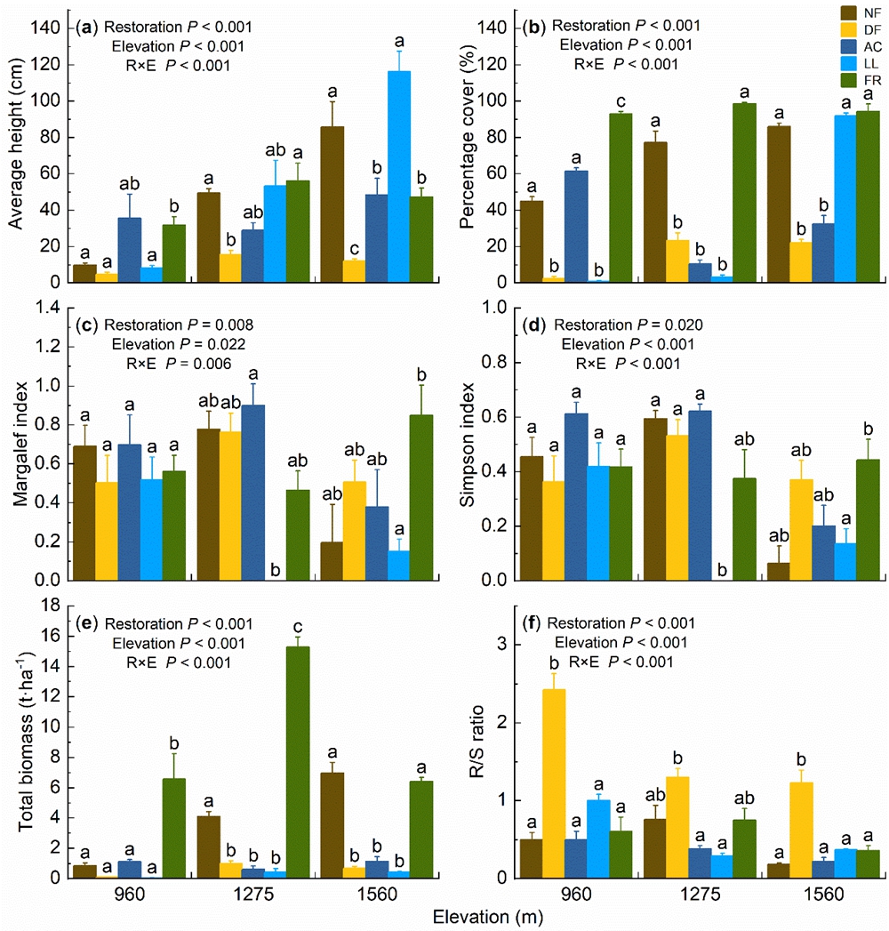 图1 不同海拔下五种恢复方式对稀树灌草丛群落组成和生物量的变化。NF,自然林;DF,退化林;AC,台湾相思林;LL,银合欢林;FR,围封林。