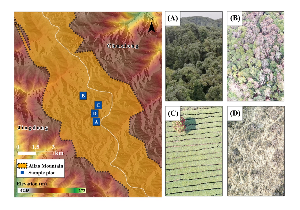 中国科学院西双版纳热带植物园(以下简称“版纳植物园”)哀牢山生态站以亚热带常绿阔叶林、滇山杨林、茶园和草地为研究对象,结合长期、连续、高频的土壤含水量监测数据,系统分析了季节尺度的土壤水分变化规律以及降水事件的入渗过程。