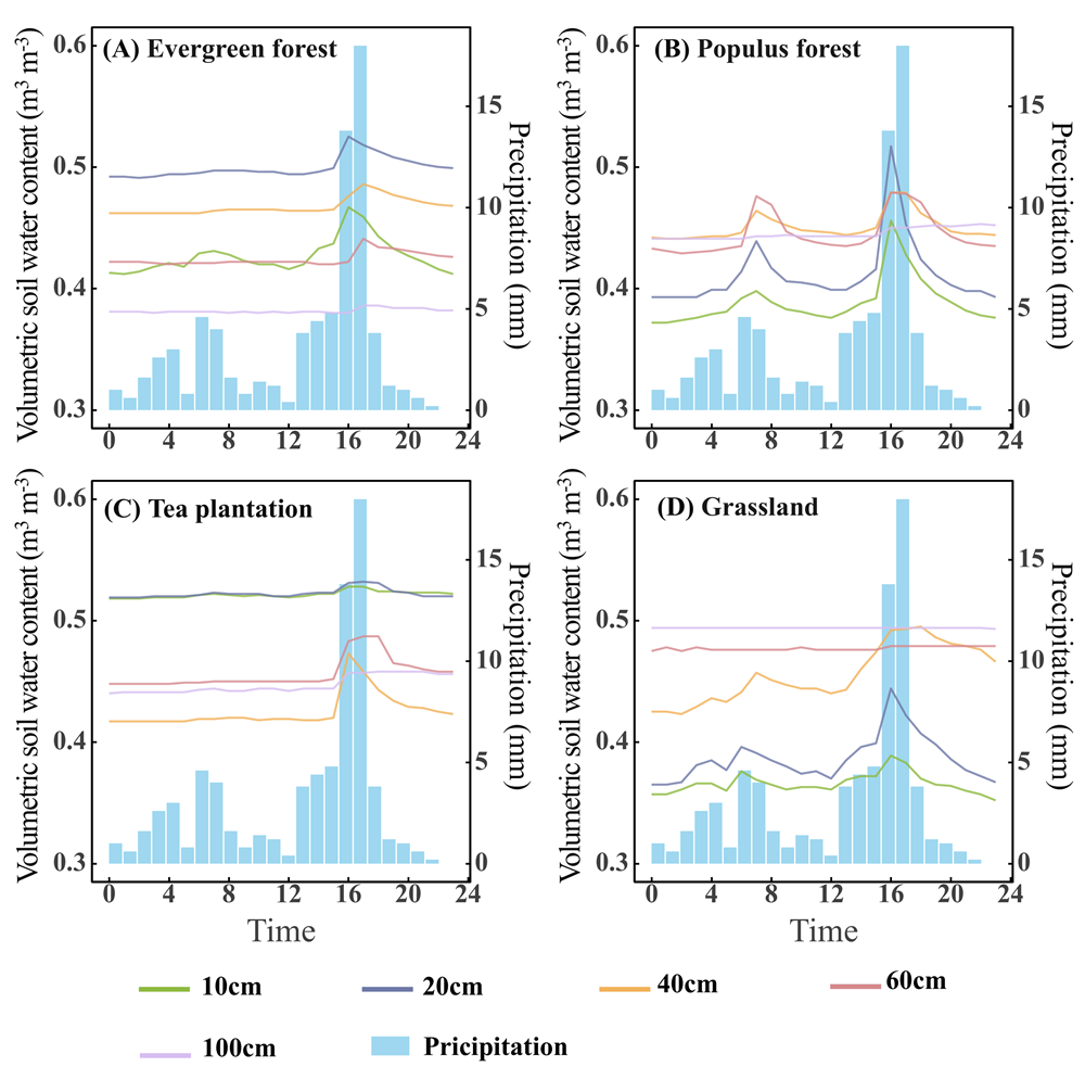 图2 四种植被类型的降雨入渗过程。实线表示不同土壤深度处的体积土壤水分含量,蓝色条形图表示降水量。