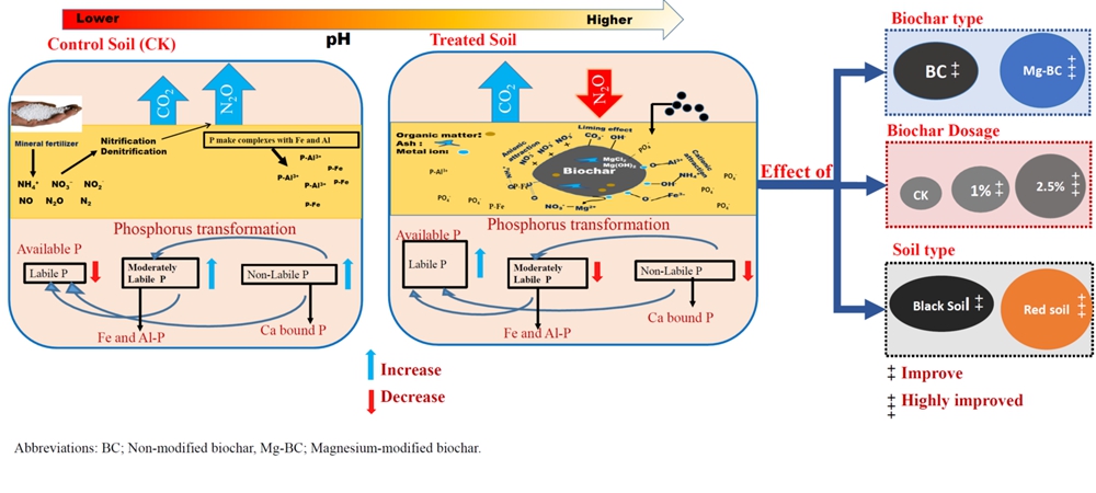 经济-社会的快速发展、人口的不断增长导致了土地资源的巨大压力,而农业的集约化方式也引起了土壤的普遍退化(如:土壤侵蚀、水土养分流失、土壤板结缺水、重金属富集、有机物污染等),尤其是磷肥利用率低、土壤磷固定严重等现象极大地制约了作物产量和生态可持续性。据统计,全球大约25%的土地严重退化、50%的土地由于人为活动而中度退化,使得当前和未来的粮食安全受到了严重威胁。因此,退化土地的可持续修复是满足全球粮食需求的重要举措。传统的磷肥施用量大但易被土壤固定,如何提高磷的有效性成为农业与环境领域的研究热点。生物炭因其改良土壤的潜力而备受关注,利用改性生物炭技术进行土壤改良、土壤环境修复,无疑是一种行之有效的有力手段和方法,但有关改性生物炭修复下的退化土壤磷组分与温室气体排放关系研究尚有待深入。