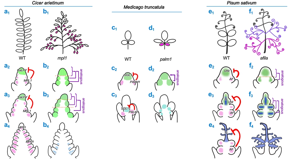 图2:由C2H2锌指蛋白PALM1/MPL1/AF和LFY/FLO构成的保守“拮抗”模块的时空特异性调控,是介导从苜蓿的三出复叶到鹰嘴豆的典型羽状复叶、豌豆的具有卷须的特殊复叶的形态建成的关键。