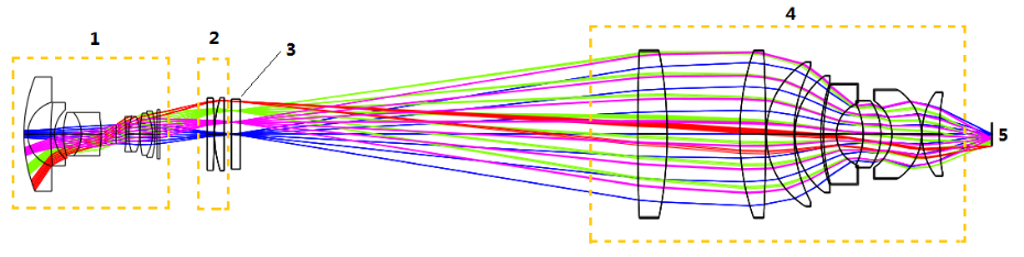 图2:RASI的光学系统结构图(1.鱼眼镜头;2.远心光路;3.窄带滤光片; 4.二次成像系统;5.探测相机)