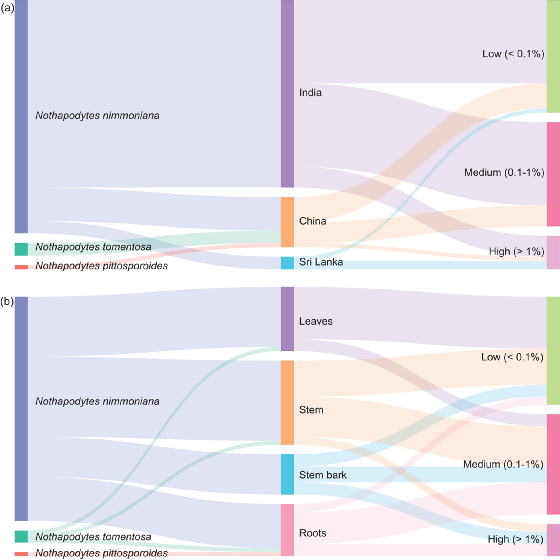 (a) 不同假柴龙树属物种——臭味假柴龙树(N. nimmoniana)、毛假柴龙树(N. tomentosa)和马比木(N. pittosporoides)在不同地理来源(印度、中国和斯里兰卡)中的喜树碱含量差异情况。根据含量水平划分为低(<0.1%)、中(0.1%–1%)和高(>1%)三类;(b) 喜树碱在不同植物部位(叶、茎、茎皮和根)中的含量差异,同样分为低、中、高三个等级。连接带的宽度表示各类别对总体喜树碱含量的相对贡献,直观反映出根部是喜树碱最主要的富集部位。