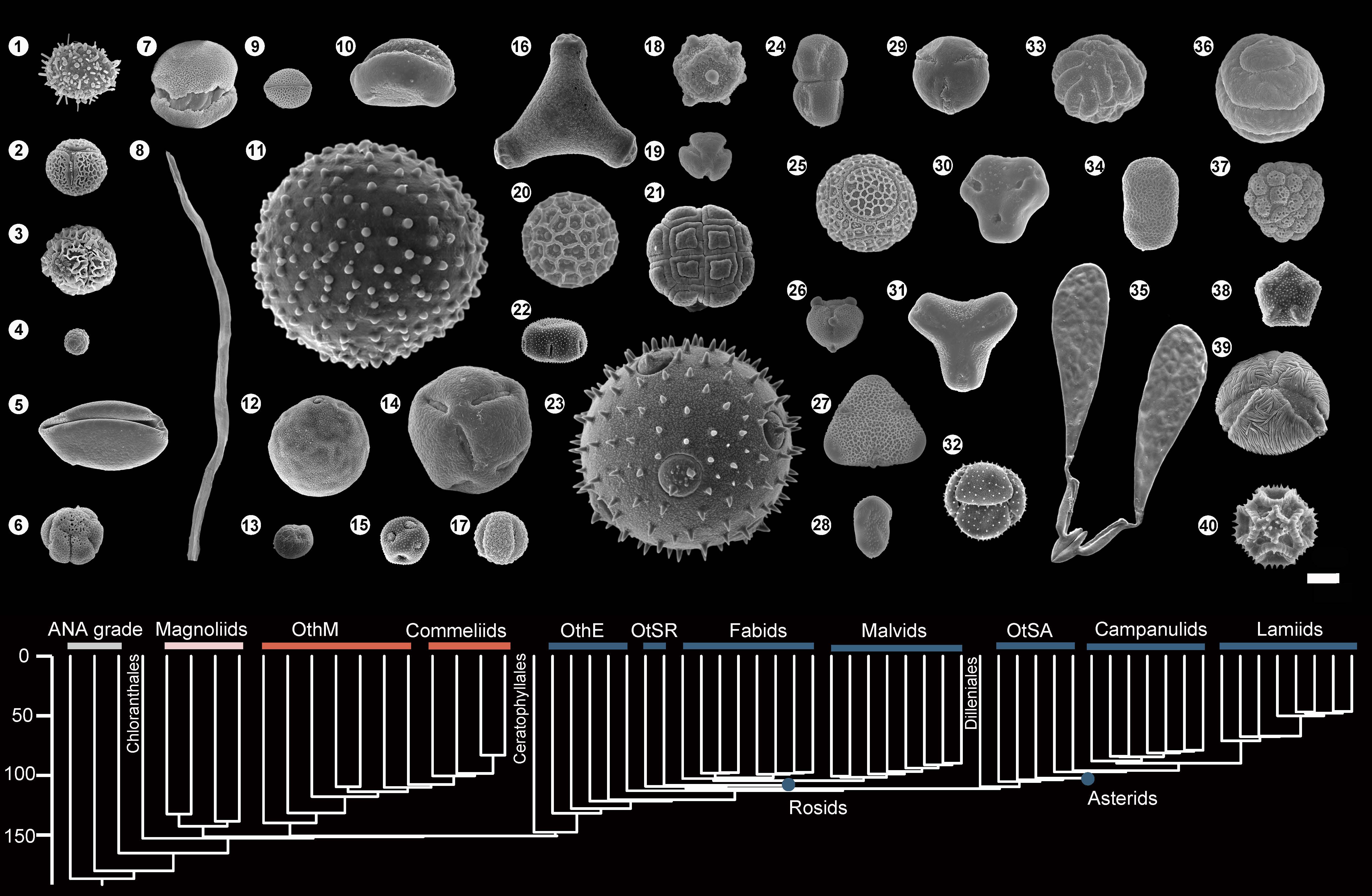 图1 被子植物多样的花粉形态,以展示APG系统框架内主要分支的花粉形态差异