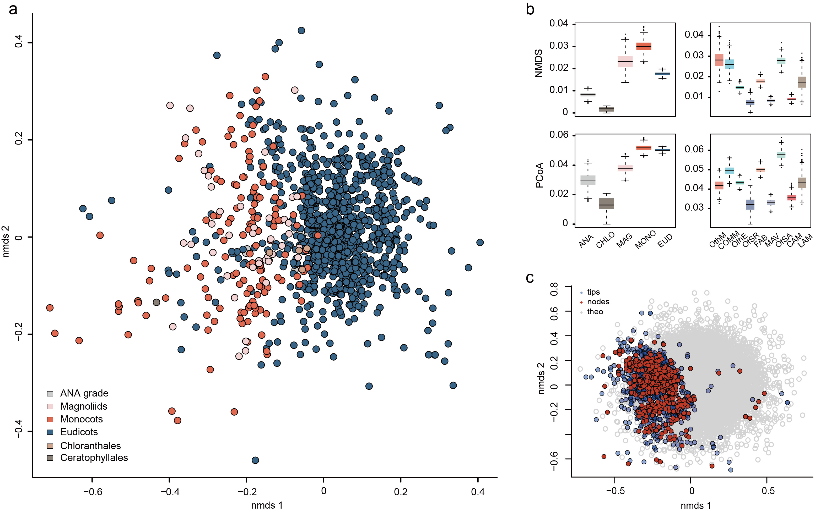 图2 被子植物花粉的形态空间展示:a) 基于nmds排序的现存花粉形态空间分布;b) 被子植物主要类群的形态多样性比较;c) 理论花粉形态空间