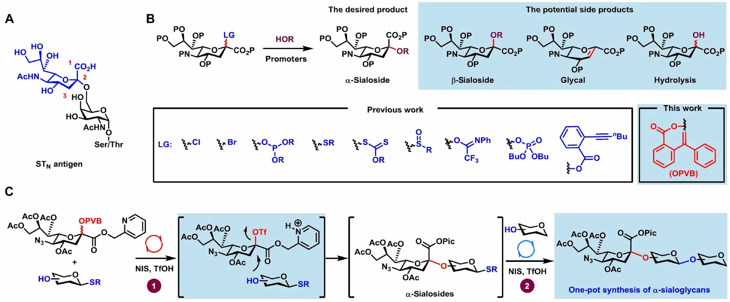 最近,中国科学院昆明植物研究所植物化学与天然药物全国重点实验室肖国志专题组报道了采用邻1-苯基乙烯基苯甲酸脂(PVB)为唾液酸离去基团,实现了α-唾液酸糖苷键的高效构建。同时,利用唾液酸PVB给体的高反应活性,实现了基于反应活性的一锅法合成各种不同的唾液酸聚糖,包括神经节苷脂Hp-s1和STN抗原。而且,通过与山东大学陆刚教授合作进行密度泛函理论计算,揭示了唾液酸PVB给体比相应的唾液酸硫苷给体具有更高反应活性的原因。