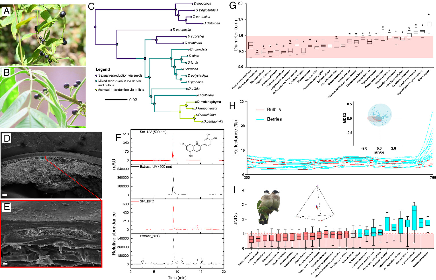 图1 A-B珠芽与相似的浆果;C黑珠芽薯蓣在薯蓣属系统发育树中的位置;D-F珠芽表皮结构与色素;G-I珠芽对浆果的模拟。