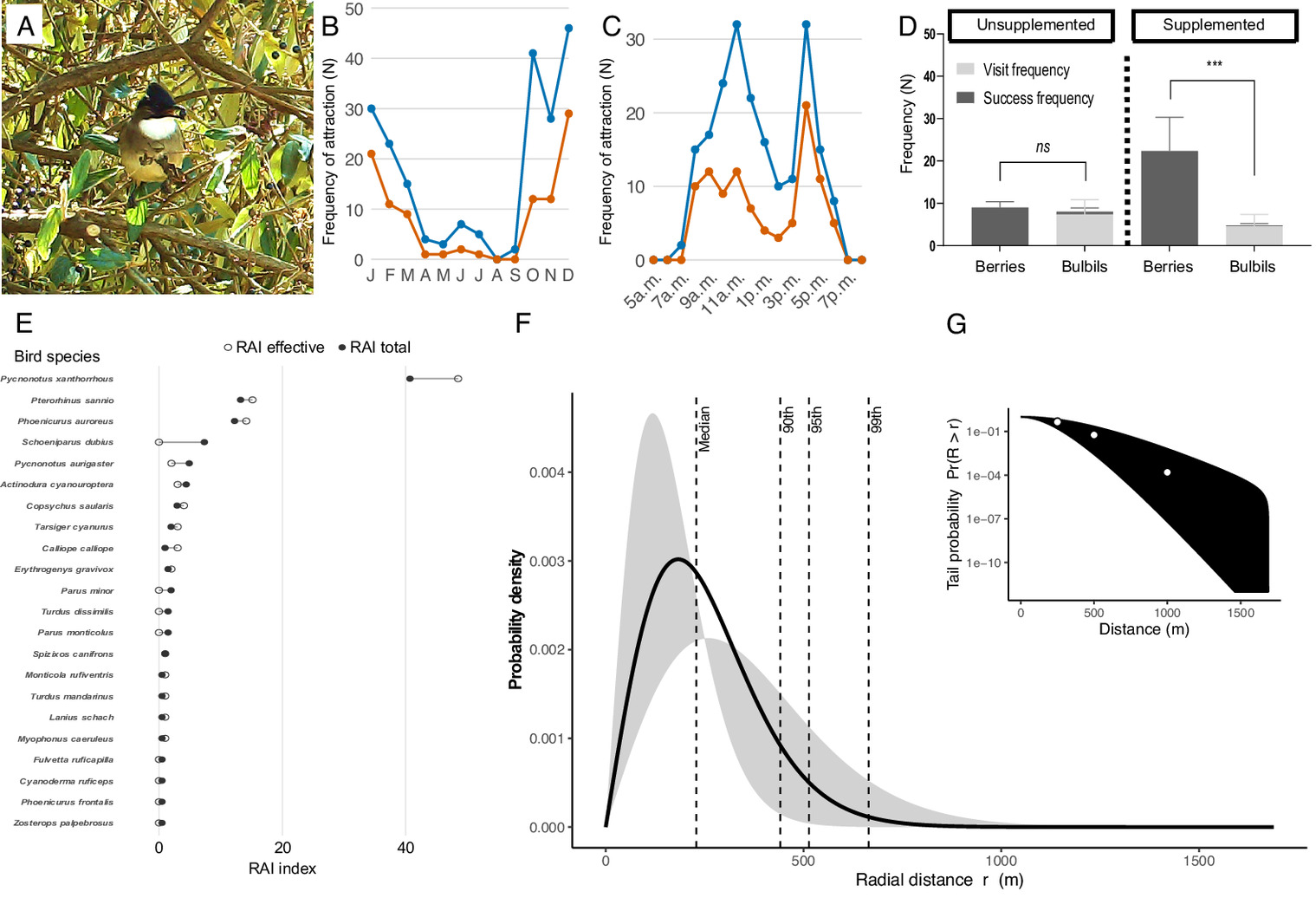 图2 A-C、E红外相机记录下的珠芽被访问的时间规律与访问者组成;D实验室环境下鸟类对珠芽与浆果的选择实验;F-G数学模型中珠芽的扩散距离。
