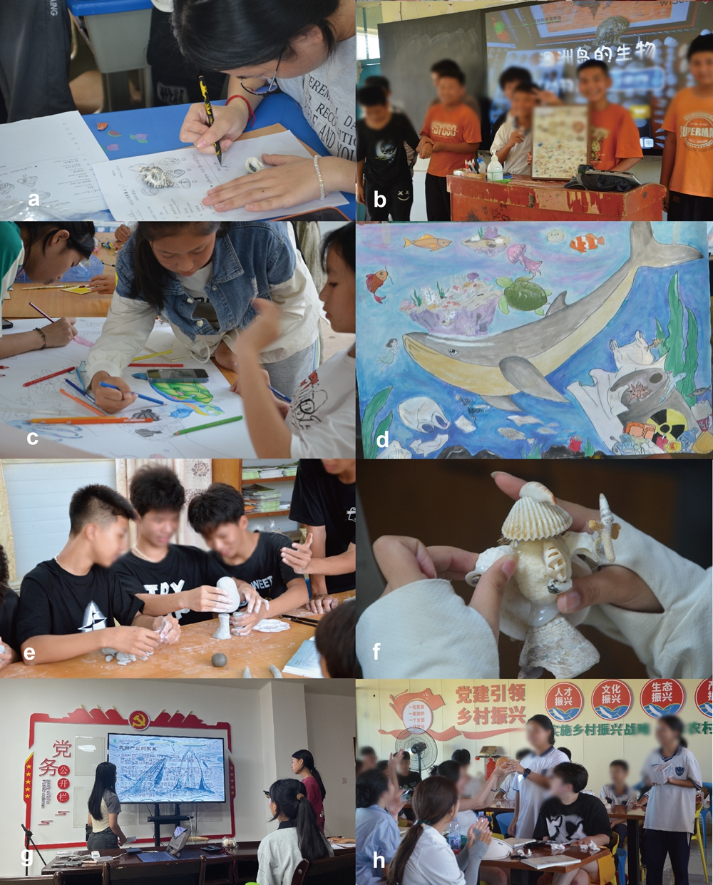 图1:教育项目活动现场照片,a:学生完成潮间带生物识别任务单;b:贝壳艺术作品小组分享;c:“我与布氏鲸”主题绘画创作过程;d:绘画作品;e:“我与涠洲岛”主题黏土创作;f:贝壳艺术作品;g:讲解活动小组排练;h:“我与布氏鲸”小小讲解员活动现场。