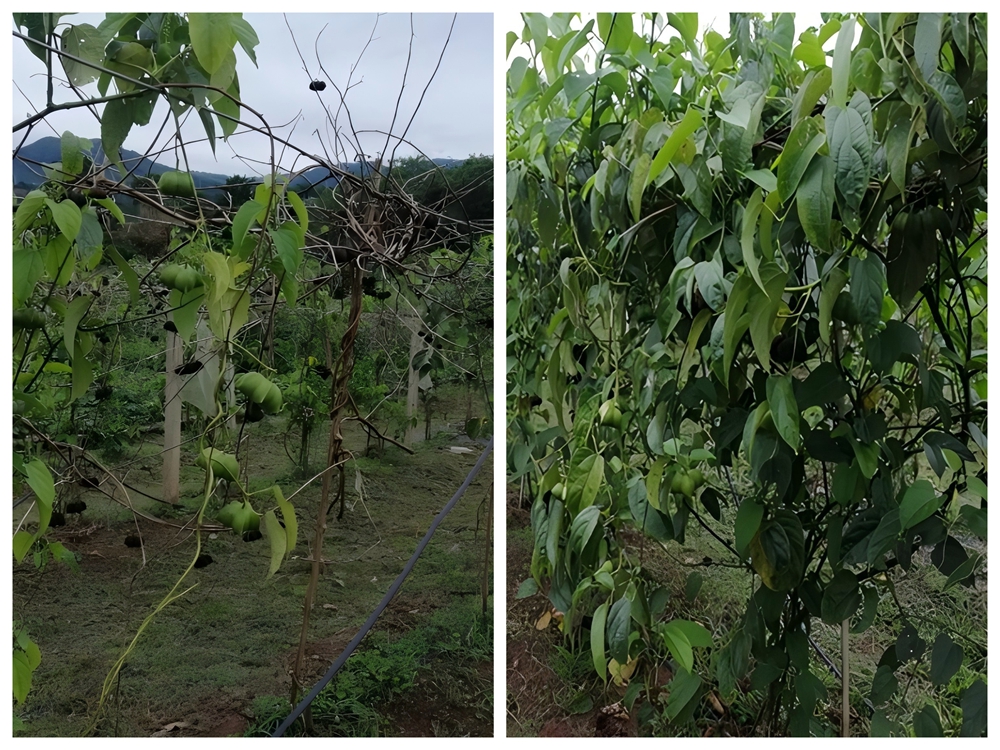 星油藤单作(左)和生石灰消杀处理(右)处理下星油藤存活状况