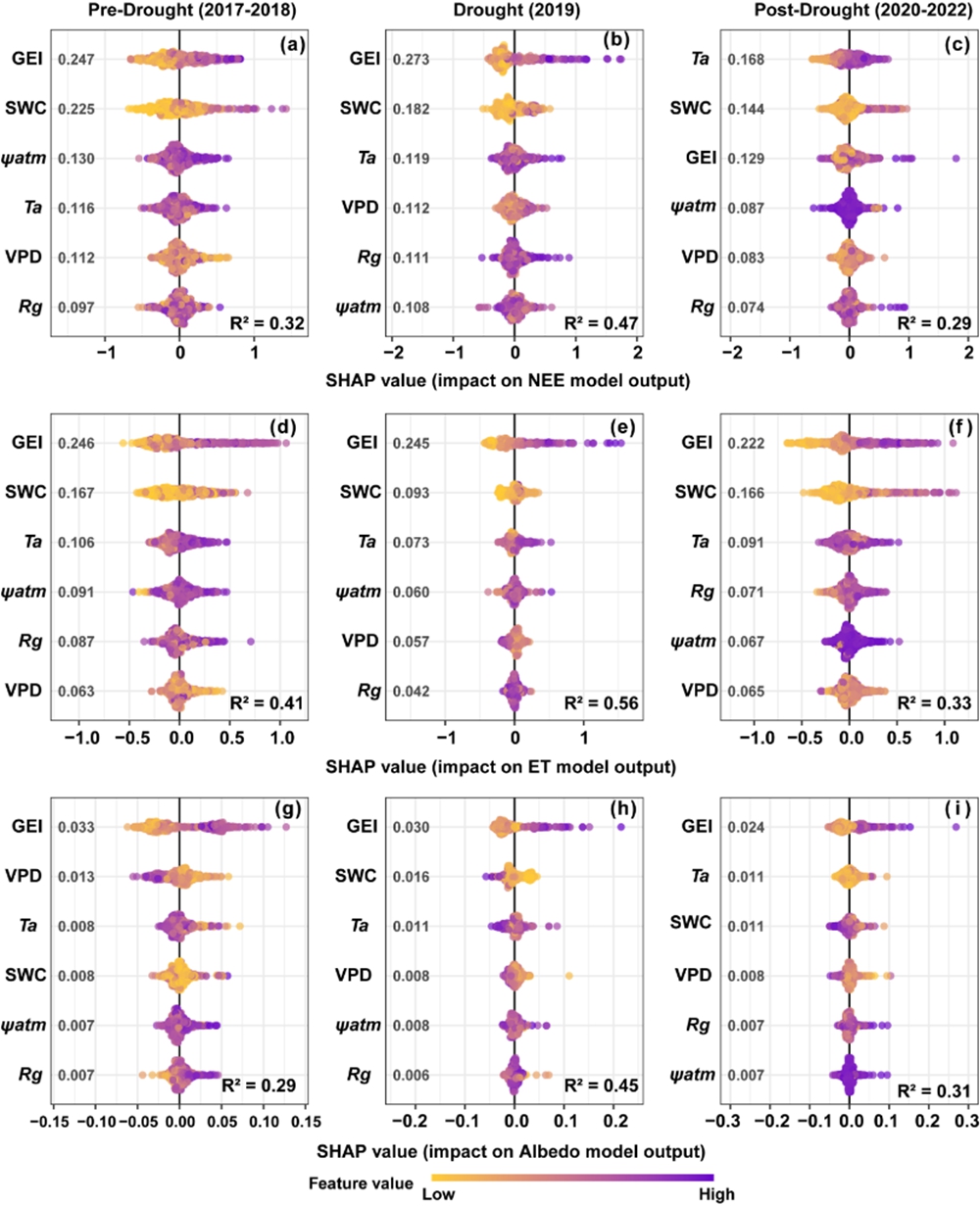 图1 干旱前年(2017-2018年)、干旱年(2019年)和干旱后年(2020-2022年)下生物/非生物驱动因素对净生态系统交换(NEE)、蒸散(ET)和反照率通量的贡献。较高的Shap值表示最重要的因素。