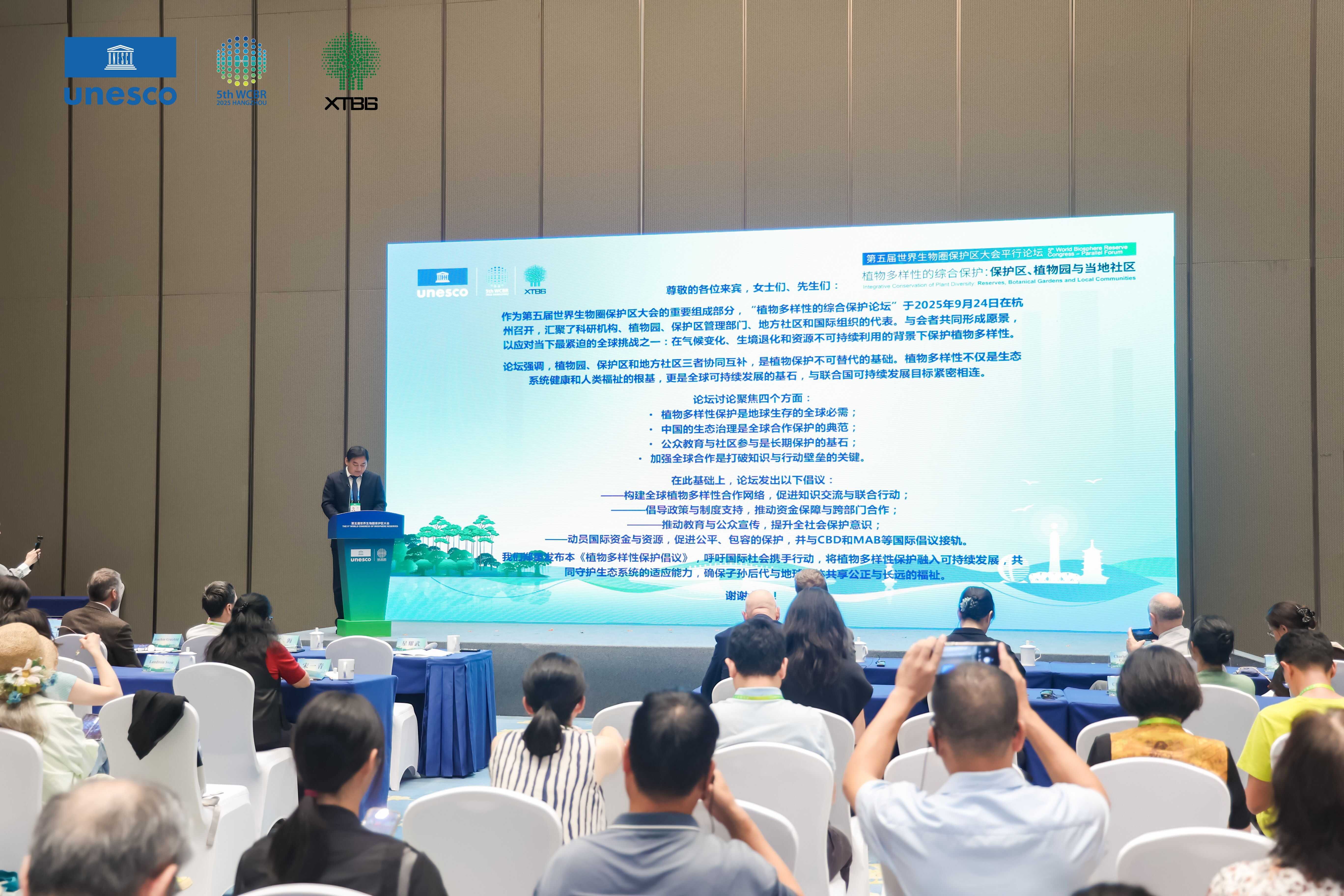 9月24日,由中国科学院西双版纳热带植物园承办的第五届世界生物圈保护区大会植物多样性的综合保护平行论坛在杭州国际博览中心举行。本次论坛以“保护区、植物园与当地社区”为主题,汇聚了来自联合国教科文组织、自然保护区、植物园和研究机构的200余名专家学者和植物保护实践者。