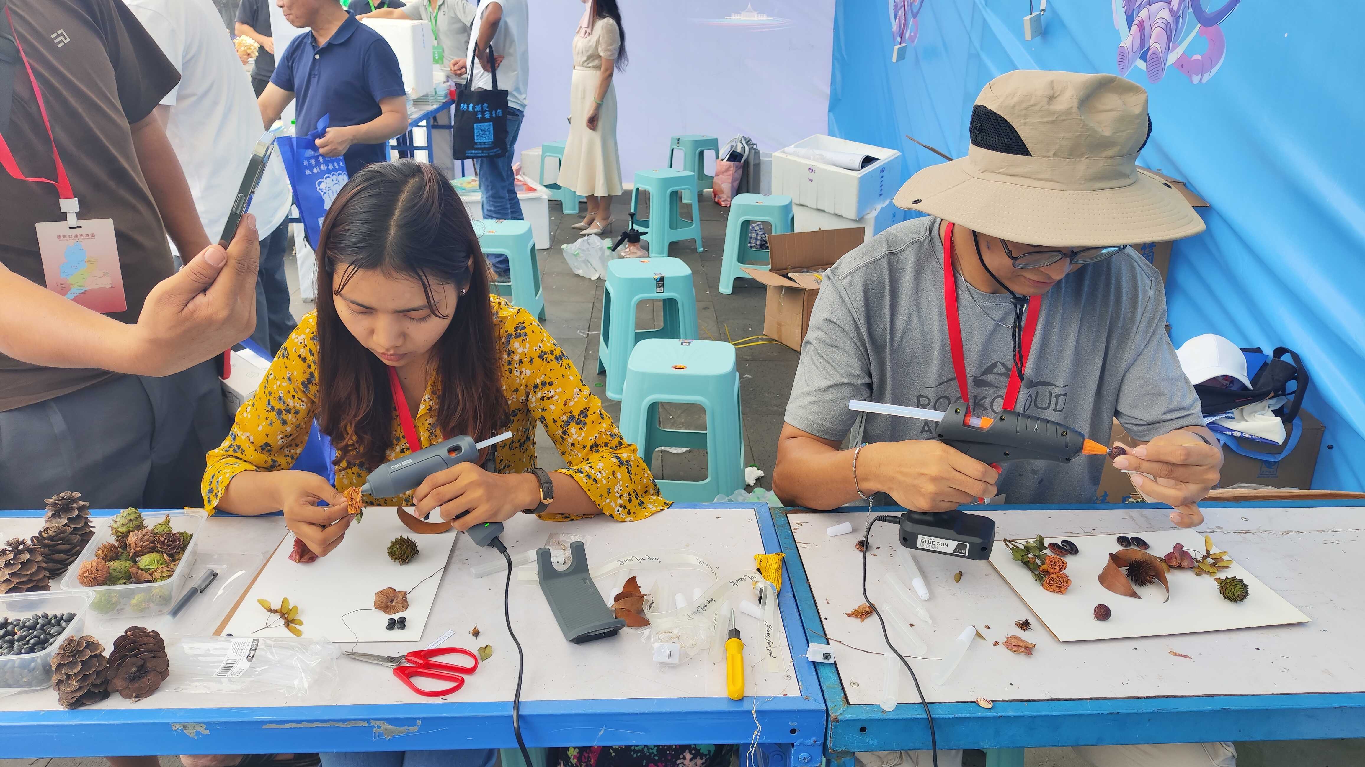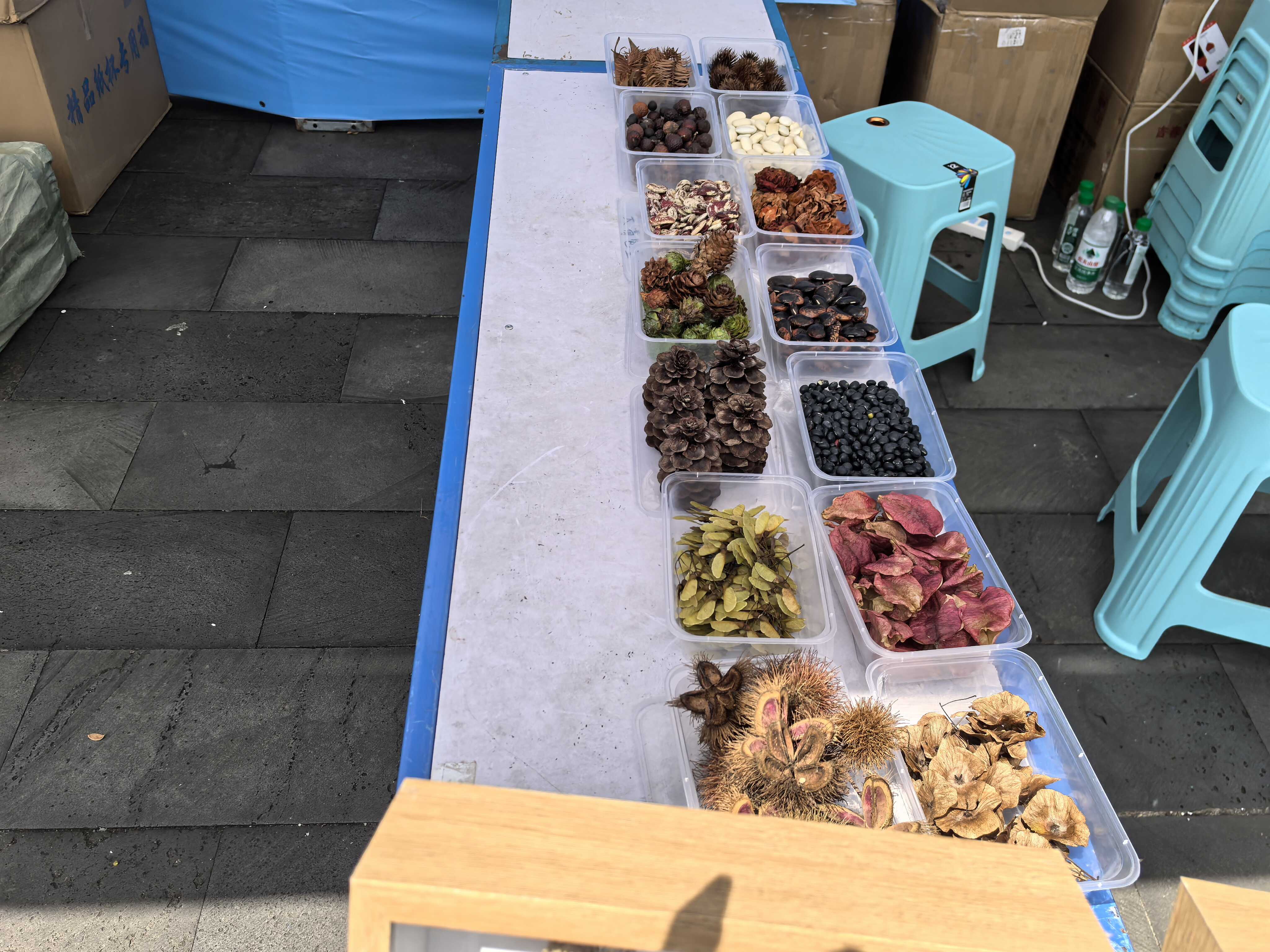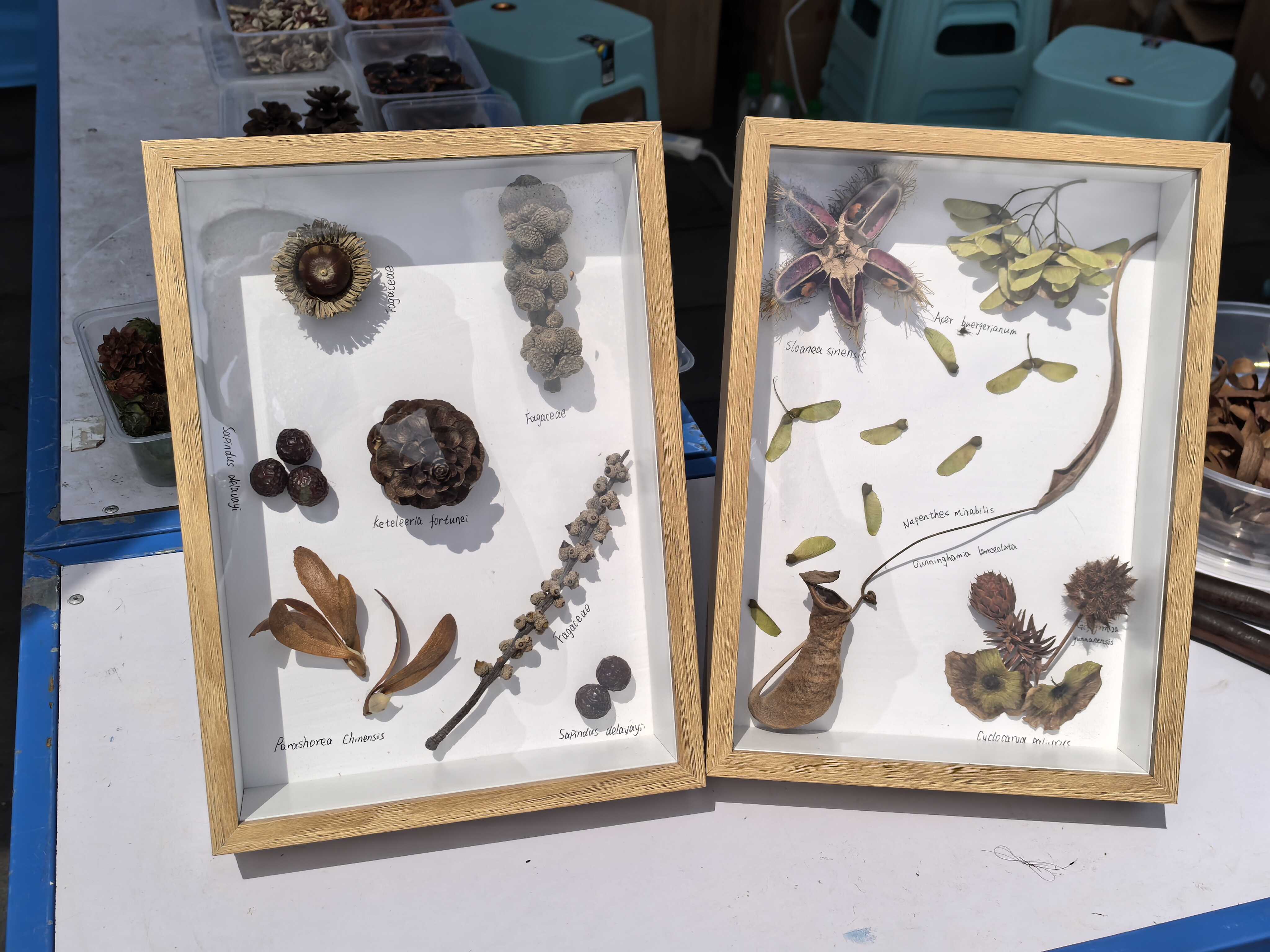 此外,昆明植物园特别策划了“博物之美”凋落物相框体验区,成了全场最具人气的焦点之一。现场准备了猴欢喜Sloanea sinensis、川滇无患子Sapindus delavayi、滇山茶Camellia reticulata等三十余种形态优美、寓意丰富的植物凋落物,供大家自由搭配。现场男女老少纷纷化身“自然艺术家”,在方寸画框中构思布局,专注打造一幅充满自然雅趣的桌面小品。在整个过程中,科普人员适时引导,讲解每一种植物凋落物的名称、特性及其在生态系统中的角色,参与者不仅可体验利用自然馈赠的乐趣,还了解了每种植物的知识。