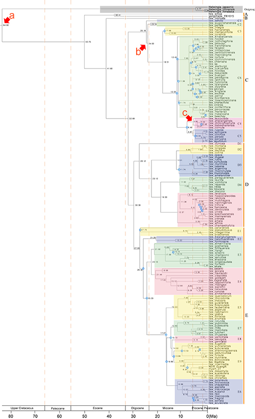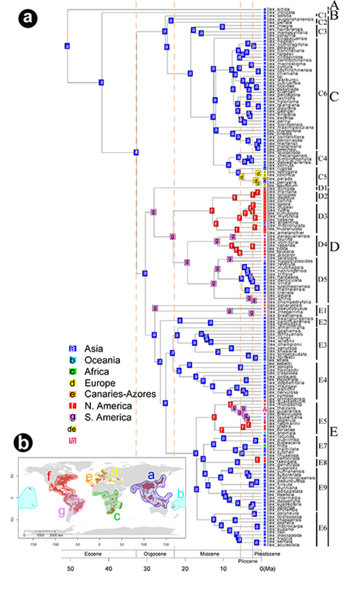 为回答冬青属系统发育及生物地理的一系列问题,中国科学院西双版纳热带植物园综合保护中心科研人员姚昕及其合作者基于覆盖所有分布区的177种冬青的两个核基因,重建了冬青属植物的系统发育关系。在此基础上,科研人员选择三个大化石作为化石校准点,重新估算了该属的起源分化时间。研究表明,冬青属冠群起源自始新世早期,随后分化出五个大分支,明显早于过去研究中估算的年龄。该属起源于东亚亚热带地区,南美洲冬青起源分化自大约3000万年前,北美洲冬青起源分化自大约2300万年前,澳大利亚冬青起源分化自大约800万年前,欧洲冬青起源分化自大约600万年前,非洲冬青起源分化自大约400万年前,夏威夷冬青起源分化自大约1000万年前。南北美洲均存在多次定殖。大化石和孢粉化石记录表明该属植物在不同地质历史时期,都能迁徙到全球温暖湿润地区定殖,且至少在中新世晚期全球变冷之前,已广泛分布于世界各地。该研究不仅为冬青属生态学和进化学研究提供了重要基础,也是作者长期关注的东亚亚热带植物多样性起源及其维持机制研究中的组成部分。