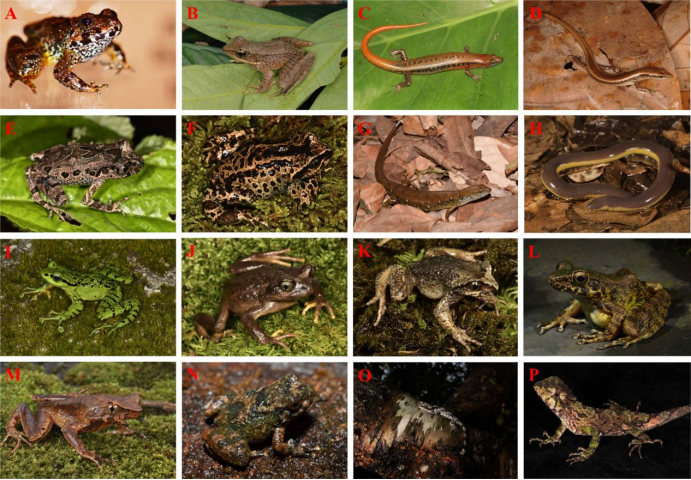 A. Limnonectes splendissimus; B. 麻点臭蛙; C. Scincella auranticaudata; D.Scincella honbaensis; E. 白缘掌突蟾; F. 豹斑齿突蟾; G. 滇南棱蜥; H. 滇西鱼螈; I. 古道湍蛙; J. 傈僳齿突蟾; K. 山精齿突蟾; L. 苏典臭蛙; M. 铜壁关角蟾; N. 铜壁关小山蛙; O. 盈江伞虎; P. 赵氏树蜥