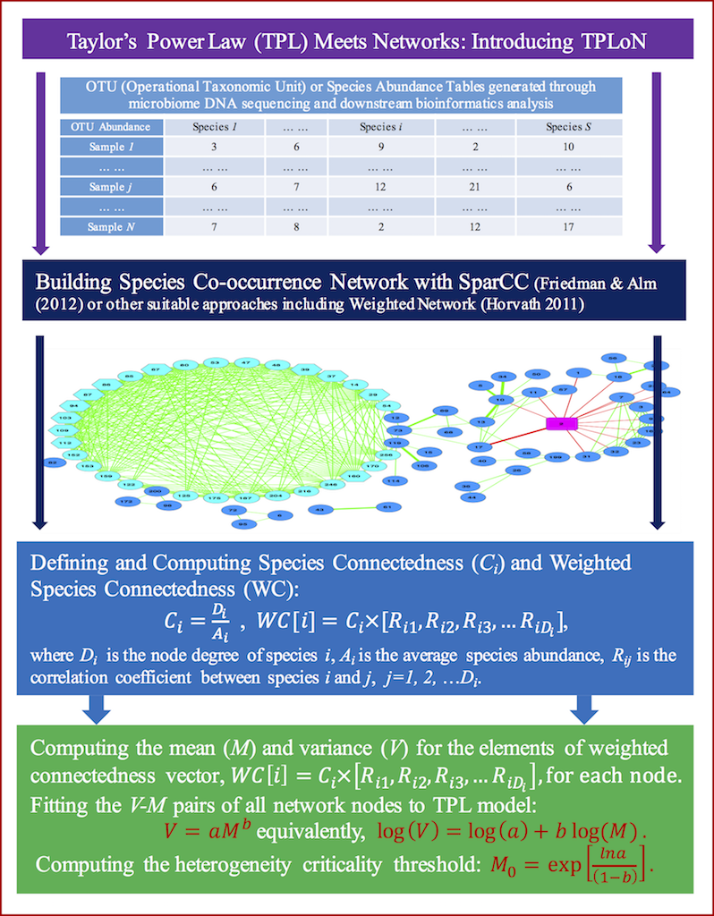 马占山于2015在《Molecular Ecology》发文将TPL扩展到群落生态学,成为分析群落异质性的核心工具之一。10年后发表在《Oikos》上的论文, 则是将其扩张到复杂网络。该论文定义了 “加权物种连接度” 新指标,首次将物种在网络中的连接数、其自身丰度、及其与邻居的相互作用强度这三个维度进行融合。以此为基础,成功构建了 “网络版泰勒幂律” 模型,从而能够尝试直接从复杂网络数据中,测量系统层面的异质性标度规律。