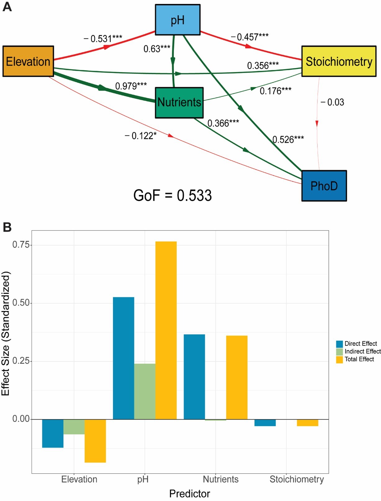 图2.PhoD基因丰度驱动因素的路径分析(a)PLSPM模型展示了海拔、土壤理化性质对 PhoD基因丰度的直接和间接影响路径;(b)标准化效应的大小(直接效应、间接效应、总效应)