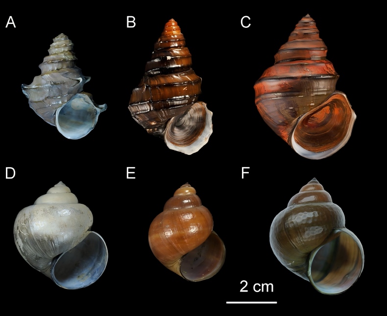 螺蛳属的部分物种的贝壳。A, 螺蛳;B 牟氏螺蛳;C, 滇池螺蛳;D, 宽体螺蛳;E, 彩云螺蛳;F, 绯壶螺蛳