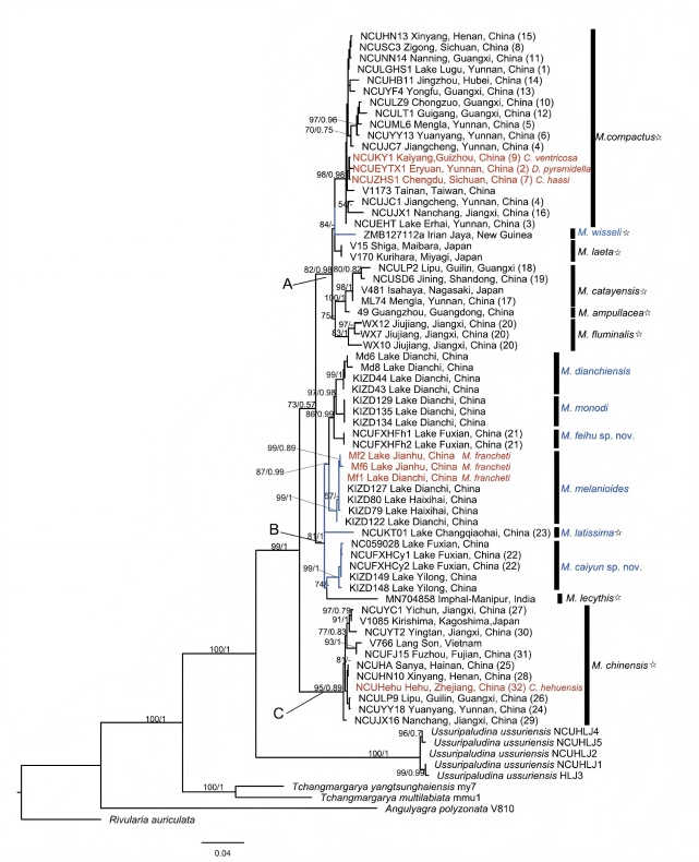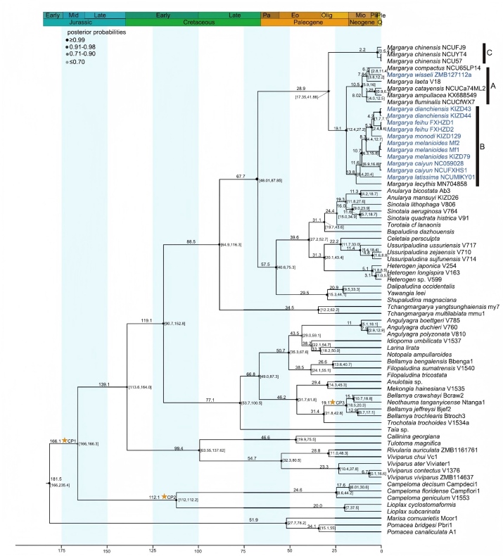 螺蛳属原先被认为仅分布于云南高原湖泊,贝壳巨大且具有包括棘刺、瘤突、龙骨这样的复杂雕刻,而东亚广布圆田螺属壳表光滑无雕饰,自建立上百年来一直被认为是不同于螺蛳属的有效属。然而此次研究中无论是基于线粒体片段、线粒体全基因组、还是线粒体-核基因联合的系统发育分析都显示圆田螺属和螺蛳各自均非单系群,而是形成了一支混杂在一起、且包含了三个主要次级分支的大单系群,其中所有原先的螺蛳属物种位于B分支,与四个具有无雕饰“圆田螺形态”的物种聚在一起。而之前的解剖学研究也显示螺蛳属与圆田螺属在重要生殖结构上极为相似,且与田螺科其他属差距较大,贝壳上的巨大差异被认为是对高原湖泊环境的特殊适应导致。化石校正的分子钟显示螺蛳属起源于渐新世,且在中新世发生了辐射演化。以上综合证据强烈支持圆田螺属是螺蛳属的次级同物异名,所有原先的圆田螺属物种应当并入螺蛳属。