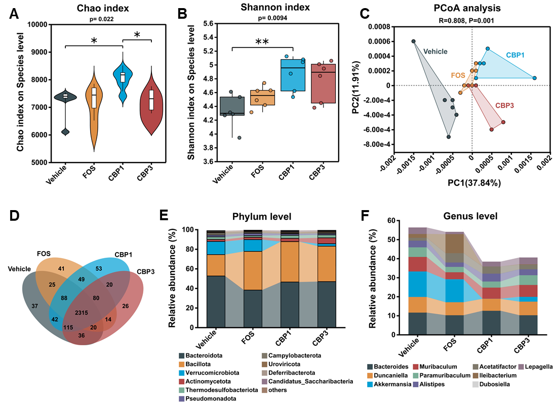 在小鼠体内实验中,相对高分子量的臭参多糖(CBP1)展现出显著的生理优势:它不仅显著提升了肠道菌群的多样性,降低了嗜黏蛋白阿克曼菌(Akkermansia muciniphila)等特定肠道微生物的丰度,还有效维持了脂质等关键代谢通路的稳态。然而,在人体粪便体外发酵模型中,低分子量的臭参多糖(CBP3)因结构简单、易被菌群快速利用,在降低厚壁菌门/拟杆菌门(F/B)比值方面表现出最强的效果。多组学分析支持了以下假设:较长的糖链与超分子结构的协同作用,使CBP1成为一种天然“缓释剂”,能够抵抗前端肠道的快速降解,从而持续为远端肠道提供营养;相比之下,体外发酵系统(缺乏完整的生理转运过程)则更青睐结构简单、易于降解的短链多糖。这些发现表明,在真实复杂的生理环境中,肠道转运时间和空间异质性等因素使得高分子量多糖具备独特的生态优势。CBP1凭借其独特的“缓释”与稳态调节能力,有望成为下一代精准微生态恢复剂和功能性食品的候选分子。