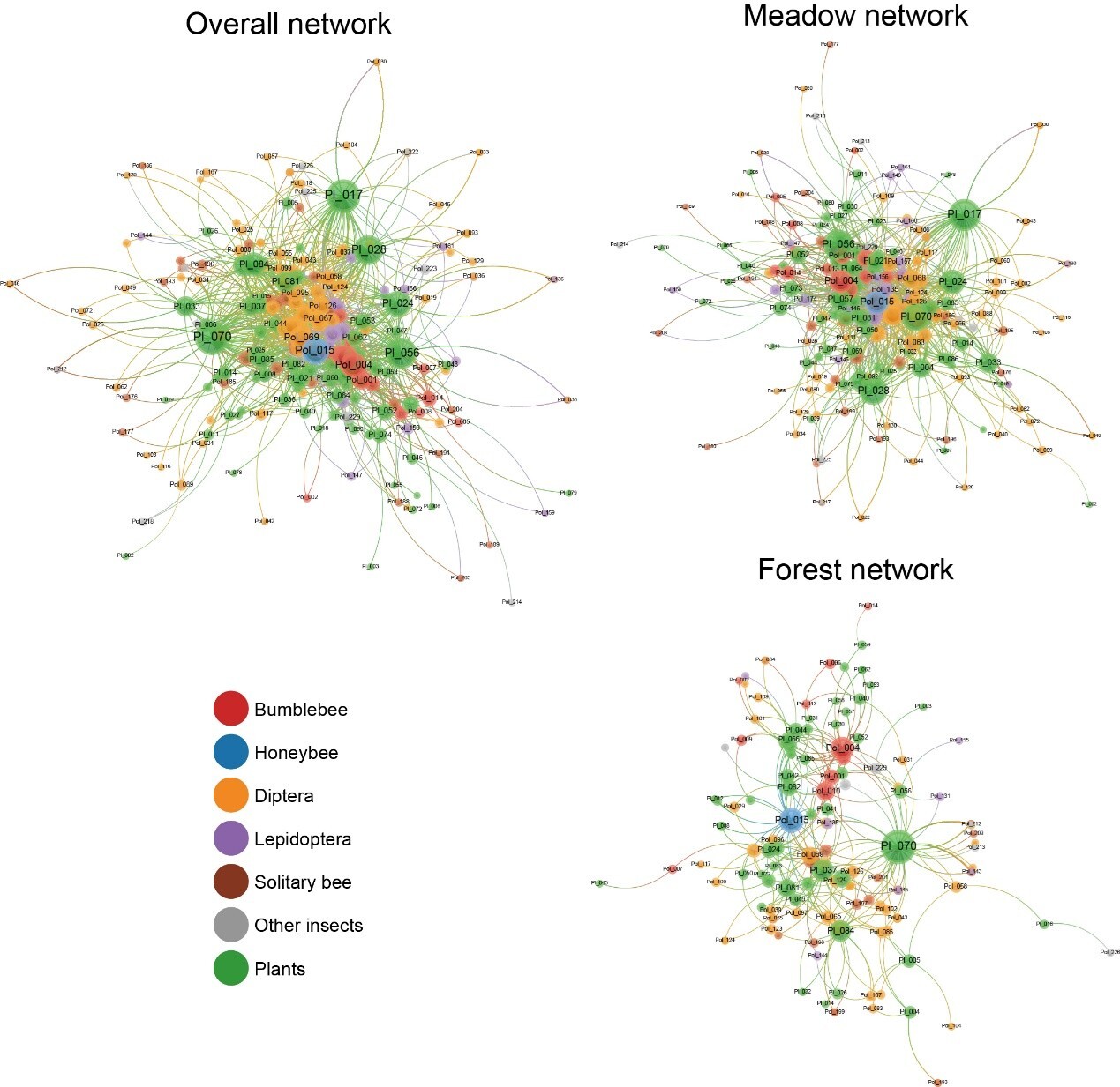 图2 整体和不同生境传粉网络。整体传粉网络(左)包含229种传粉昆虫和89种植物;草甸网络(右上)包括216种传粉昆虫和81种植物,而森林网络(右下)包含101种传粉昆虫和57种植物